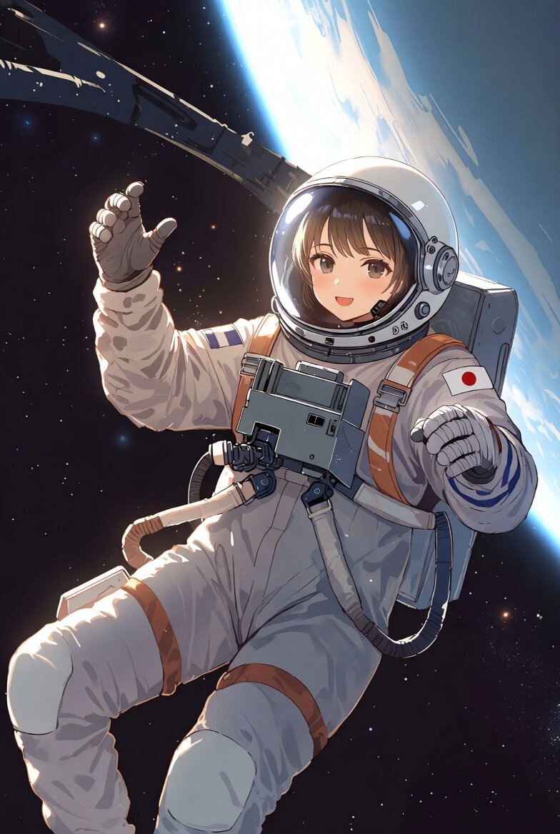宇宙飛行士の日本人女性のイラスト。宇宙服を着て船外活動をしている。無重力や宇宙空間を感じさせるダイナミックな構図で。