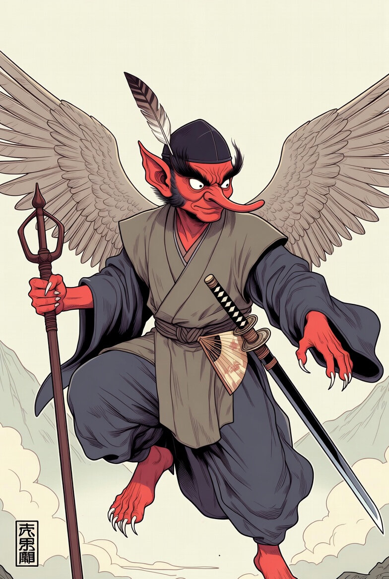 日本の妖怪である天狗のイラスト。恐怖を与えず、コミカルなタッチ。天狗は、山伏姿で、顔が赤く、鼻が高く、翼があって、手足の爪が長く、金剛杖・太刀・うちわをもち、神通力があり、飛行自在という特長がある。