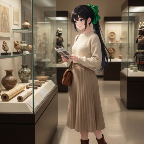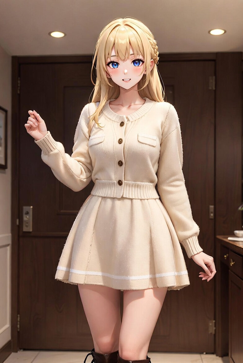 16-year-old, kawaii, cute_face, tareme, inocent_smile, no_makeup, beautiful_anime_girl, blonde_hair, long_hair, straight_hair, blue_eyes, beautiful_eyes, large_breasts, beautiful_breasts, bare_legs, 軽いメイク、遊び心のある可愛い表情で微笑む、フルボディ、高級ホテルのロビーが背景。ライトベージュのニットカーディガンワンピースを着用、長袖、ボタンダウン前端、小さなボタン、胸ポケット、白いトリムが袖口・襟・ウエストにアクセント、テクスチャードニット生地に微かなラメ、ボディフィットからフレアAラインのミディ丈スカート(ふくらはぎ中間まで)。ダークブラウンのレザー膝丈ブーツ(ヒール付き)を合わせる。一方の手は優雅に上げ、もう一方はリラックス、軽くスカートが広がるポーズ。