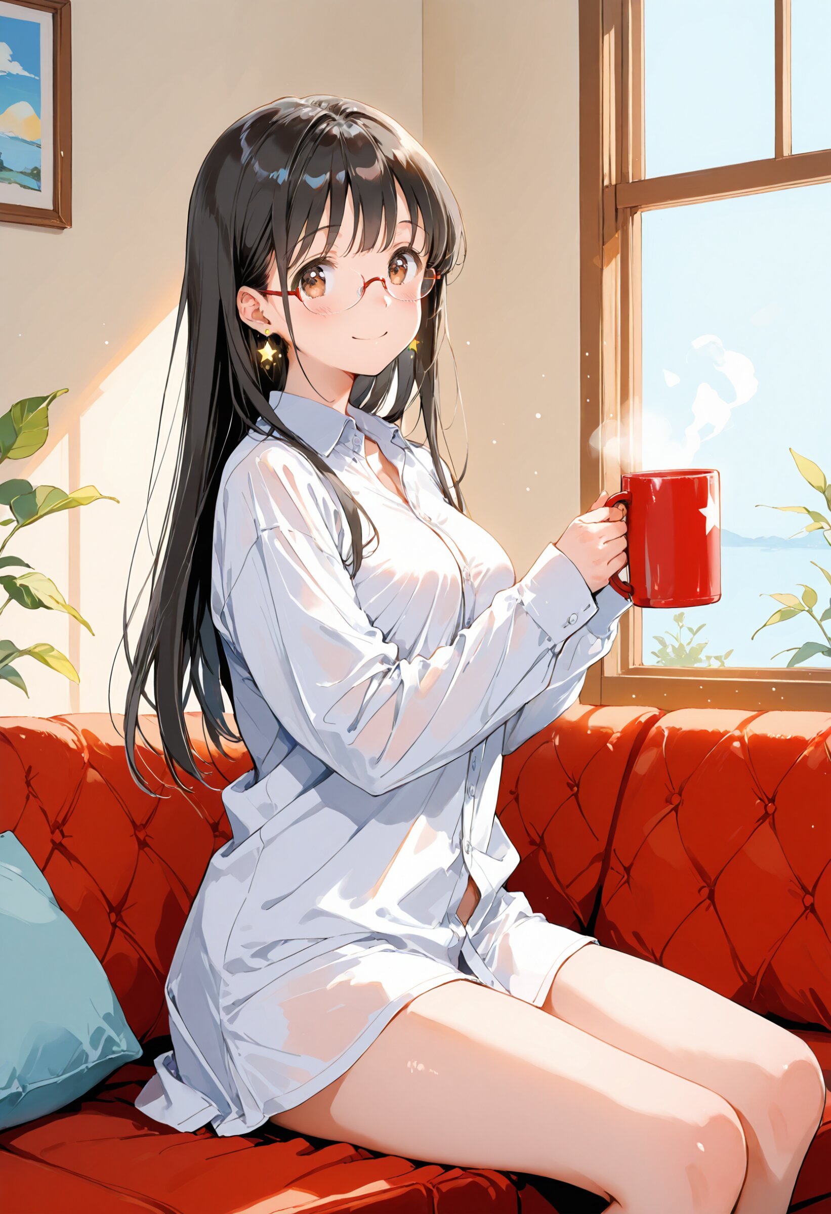 syojo anime style illustration, fine lineart with low contrast, 1girl, 17 years old, 155cm tall, brown eyes are shining and cute, black hair, long hair, extremely detailed neat hair,Straight hair, tareme, ((red semi-rimless eyewear:1.2)), star earrings, medium breasts, smile, blushful, happy, compassion, looking back over her shoulder, holding two mugs, wearing an oversized white button-down shirt, loose fit, long sleeves, bare legs, living room, large window, white cartain, Soft watercolor texture, clean line art, pastel color palette, airy and transparent aesthetic, high-key lighting, trending on Pixiv, art by Momoco or Anmi style.