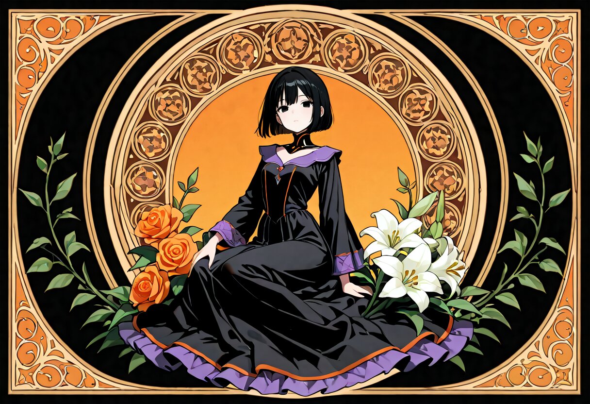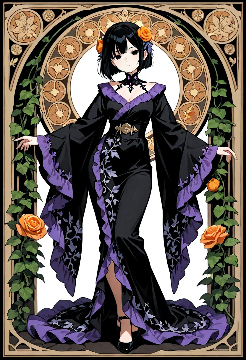 masterpiece,best quality,amazing quality,4k,very aesthetic,high resolution,ultra-detailed,absurdres,art nouveau,Mucha style, Smooth_Quality, beautifully detailed face, fine detailed eyes, BREAK, 1girl,solo, 19yo, bob cut, black hair, black eyes, empty eyes, dull eyes, mechanical collar, (expressionless), black dress, purple trim, full body, hair ornament, decorative hair, elegant pose, organic ornamental design, flowing vine-like curves, white lily, orange rose, floral motifs, vine pattern, ivy, leaf pattern, BREAK poster art, flat lighting, elegant feminine silhouette,