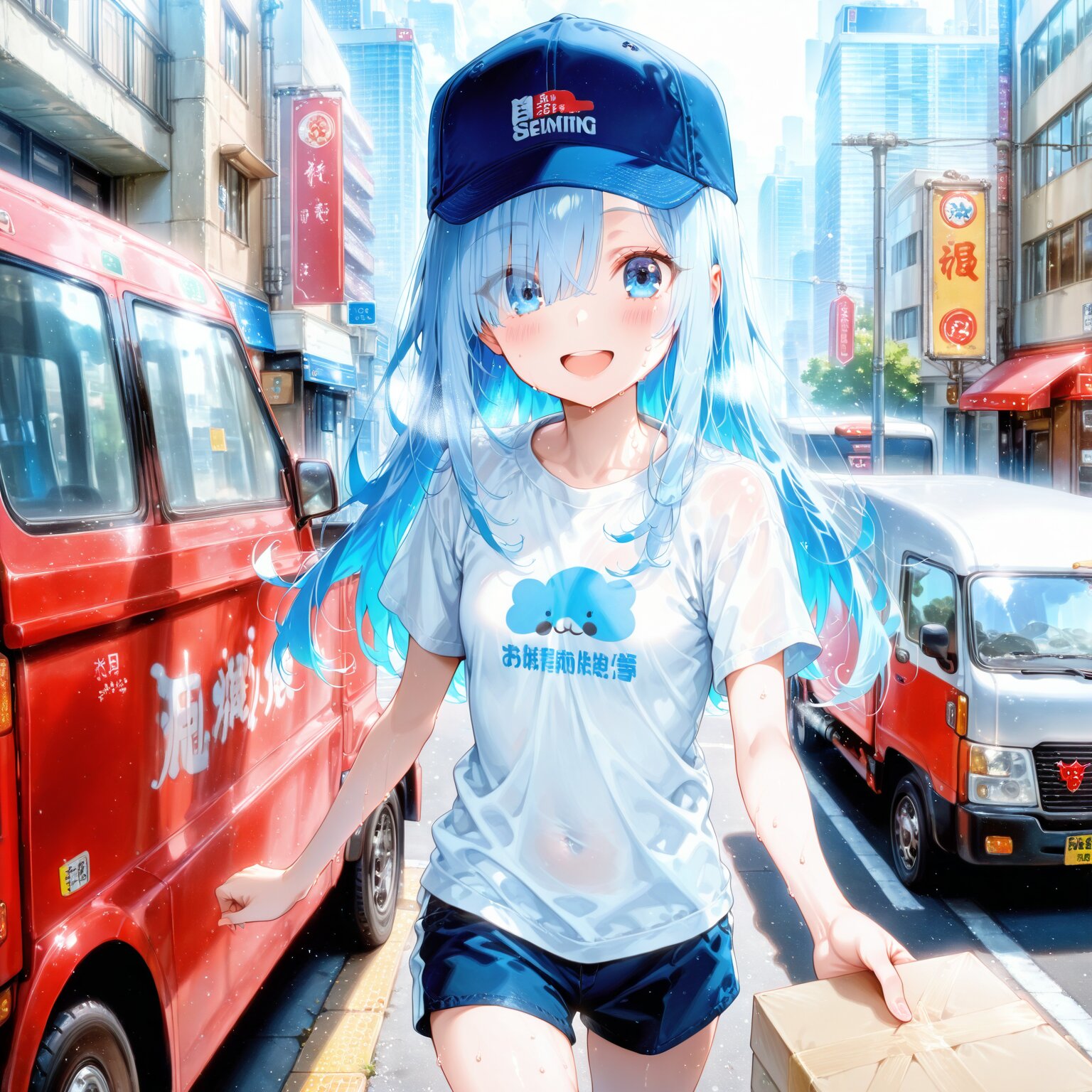 1girl,blue hair,long hair,skinny,petite,small_breasts,blue eyes,eyes visible through hair,short sleeve T-shirts,shorts,smile,open mouth,walking,city,hat,hold the box with both hands,delivery truck,sweat,<lora:illustrious_masterpieces_v3:1>,<lora:Smooth_Booster_v4:1>,, Masterpiece, Best quality, Amazing quality, Very aesthetic, Absurdres, Newest,anime_coloring,