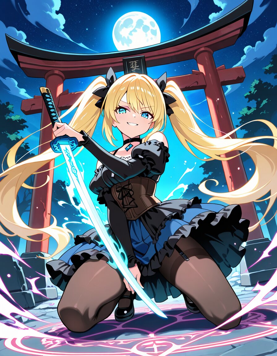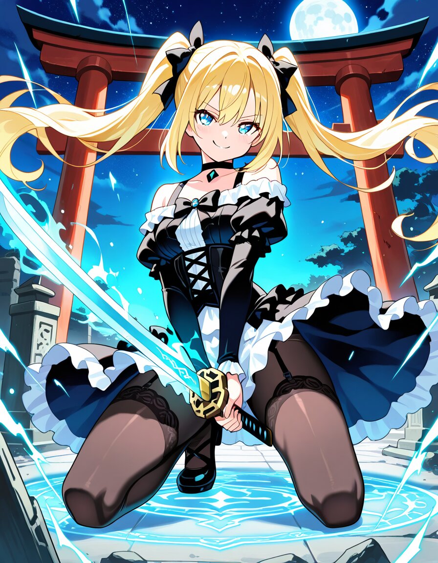 masterpiece, best quality, absurdres, ultra detailed, high resolution, anime style illustration, 1girl, solo, blonde long hair, twintails with black ribbons, blue eyes, sharp confident gaze, smug smile, gothic lolita dress, black frilly dress, off-shoulder puff sleeves, lace trim, corset lacing, black choker with lace, black arm warmers, black pantyhose, sheer stockings, garter belts with bows, black mary jane shoes, kneeling on one knee, dynamic pose, holding large katana with both hands, detailed japanese sword, black diamond pattern hilt, gold tsuba, white glowing damascus blade, intense cyan blue-white energy aura around blade, sparkling light particles, sword glow illuminating face and dress, massive intricate glowing magic circle under feet dominating the scene, huge blue cyan summoning array on ground with complex layered arcane runes symbols glyphs, powerful summoning ritual effect, violent rising energy beams and light pillars from circle, swirling sparkling magical particles aura, ethereal cyan light rays exploding upward, intense glow reflection on uniform dress pantyhose and ground, overwhelming magical power, night ruined japanese shrine background, broken torii gate, ancient temple ruins, full moon, starry sky, moonlight rays, dramatic lighting, rim light, dark fantasy atmosphere