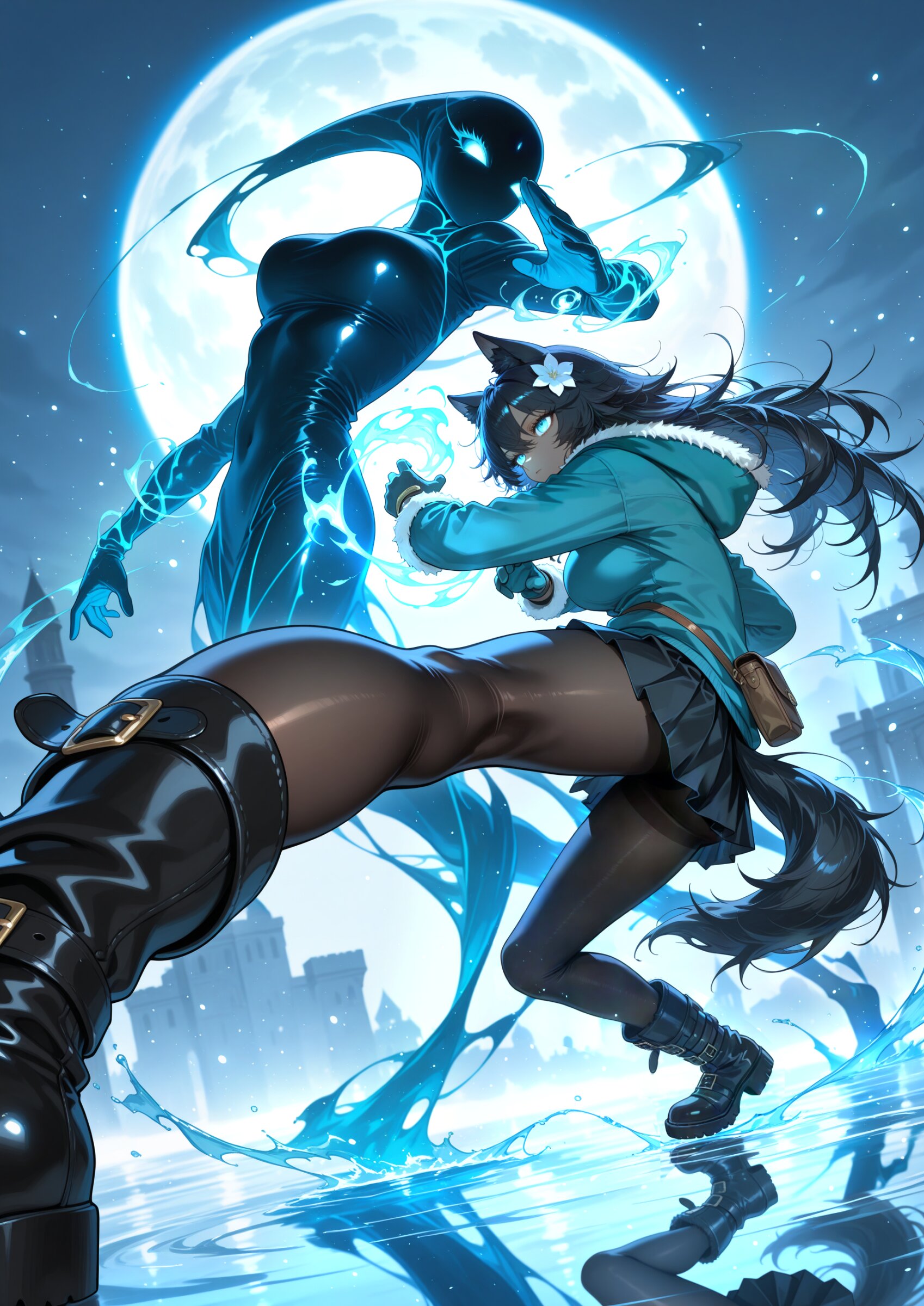 foreshortening, close to viewer from side facing away, looking up, facing ahead, facing to the side 1girl, black wolf ears, dark skin, young beautiful girl, large breasts, tall, wolf tail, (aristocratic features), (Black Hair:1.2) (disheveled long hair over ears:1.3) messy hair ornament flower, (perfect turquoise eyes:1.3) long eyelashes,, wearing turquoise hood down, winter gloves, black lether miniskirt, belt boots, turquoise hoodie, hooded jacket, winter coat, fur boots, black pantyhose, belt bag,, muted color bronze gloves, water magic, , kung fu attack, kung fu pose, kung fu action, (swirling energy,energy magic,energy:1.2), winter atmosphere, water magic, water flood, great clear water, reflection, , battle, duel, medieval fantasy world, battle (huge muted color bronze silhouette of human, faceless monster:1.3), (muted color bronze monster:1.2), duel, fighting, danmaku, midair incoming attack, super fine concept art, hard surface, 8K, masterpiece, best quality, amazing quality, very aesthetic, absurdres, professional art lots of details, , overexposure, shiny-glistening, (watercolor style:0.0), (pastel color style:0.0) 4ur4_illu,shiny, glowing, glowing particles, glowing light particles, light particles, <lora:noline (1):1.0> <lora:sdxl2-flat2-512b:-0.2> <lora:facelightup_xl_v10:0.5> <lora:V2_yakumo_alchemy:0.5> <lora:Aura_illu:0.1>