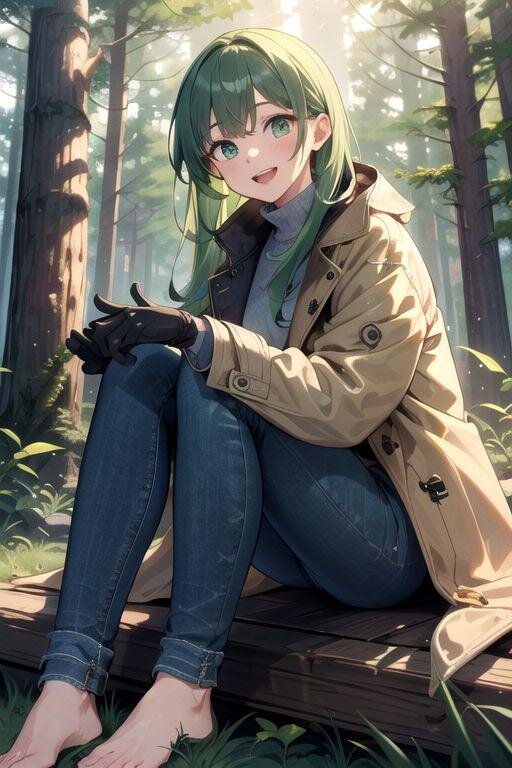 green hair, very long hair, green eyes, gloves, barefoot, (long toes:1.3), (long jeans:1.4),(coat:1.3),smile,open mouth, forest background