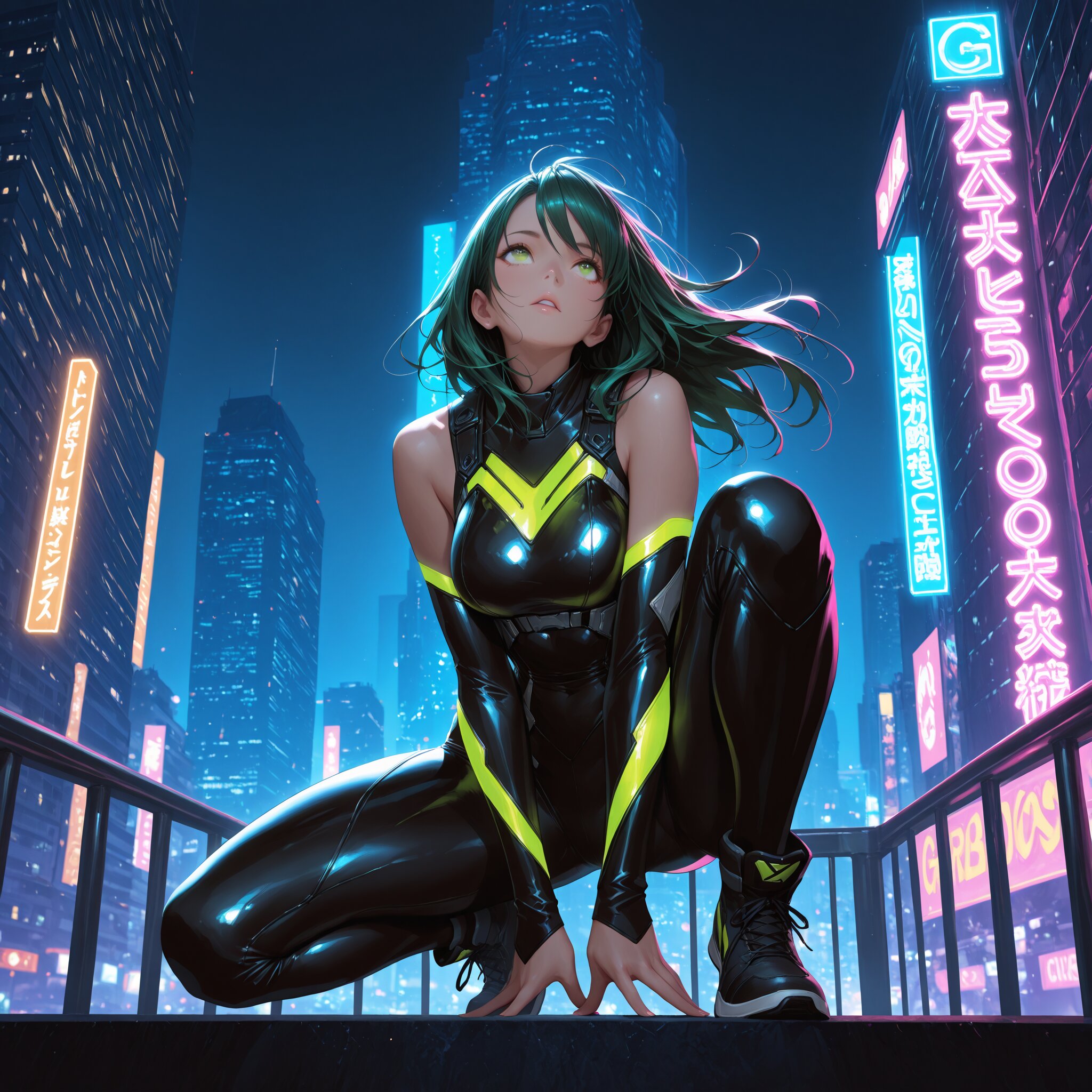 masterpiece, best quality, photorealistic, sharp focus, cinematic lighting, depth of field, beautiful composition, vibrant colors, ultra high res, 8K, highly detailed, masterpiece, best quality, very detailed, (masterpiece:1.2), (best quality), (ultra-detailed), 1girl, solo, gorgeous woman, crouching on a narrow railing of a skyscraper, predator-like pose, one hand touching the ground, extreme low angle looking up, dynamic balance, wind-blown hair, sharp green eyes, wearing tech-wear outfit, breathtaking city night background, glowing neon lights below, depth of field, cinematic action shot, high contrast, rim lighting, 8k wallpaper.