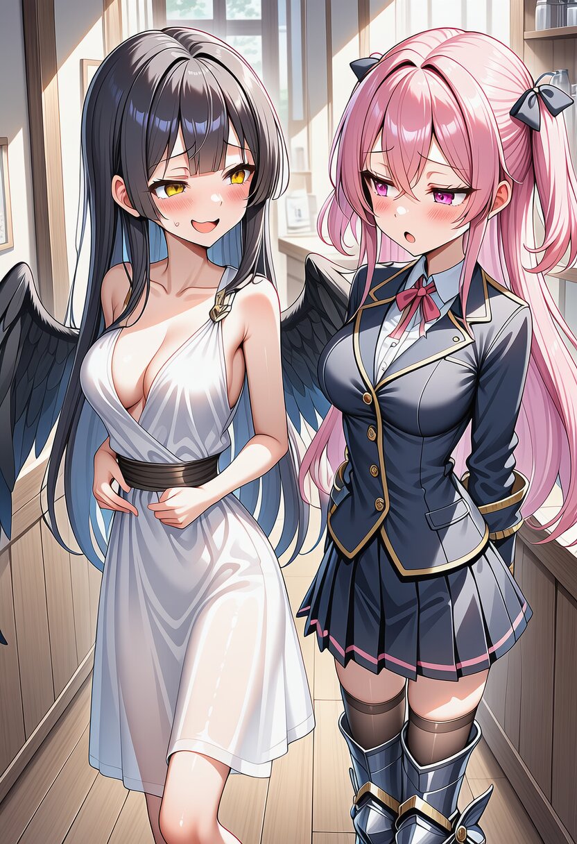 ai-generated, year 2024, anime style, 2girl, side by side, looking at viewer, midday, indoor, 1.0::in Mediaval PUB::, from front, masterpiece, best quality, ultra detailed, perfect fingers, high resolution, absurdres, perfect anotomy, detailed background, unity 8k wallpaper, location, -2.5::hugging::, very aesthetic, masterpiece, no text