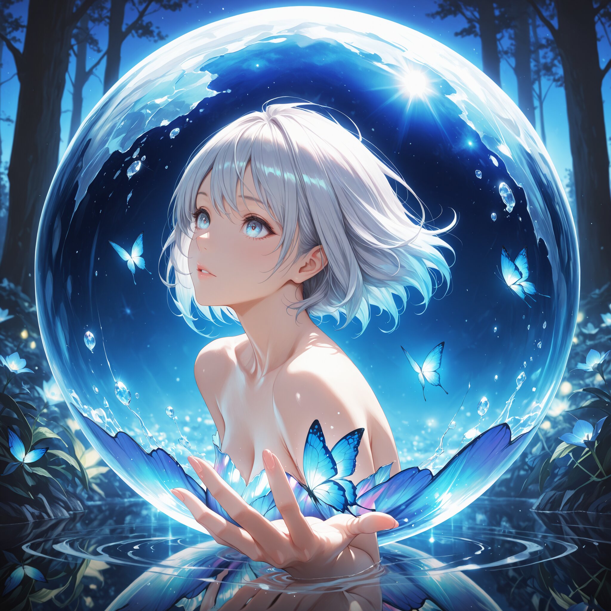 masterpiece, best quality, photorealistic, sharp focus, cinematic lighting, depth of field, beautiful composition, vibrant colors, ultra high res, 8K, highly detailed, masterpiece, best quality, very detailed, (masterpiece:1.2), (best quality), (ultra-detailed), 1girl, solo, ethereal beautiful woman seen through a giant floating crystalline water sphere, refraction effect, distorted and magnified reality inside the sphere, inside the sphere is a vibrant fantasy forest, outside is a soft blurry moonlit sky, glowing blue butterflies, silver hair, deep blue eyes, iridescent skin, kaleidoscopic light, cinematic lighting, dreamlike atmosphere, unique perspective, sharp focus on the sphere's reflection.