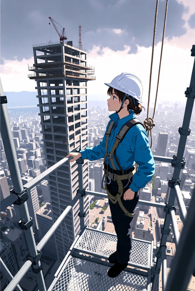 An illustration of a Japanese woman, a tatewaku worker, on the scaffolding of a high-rise building under construction, emphasizing height in the composition.