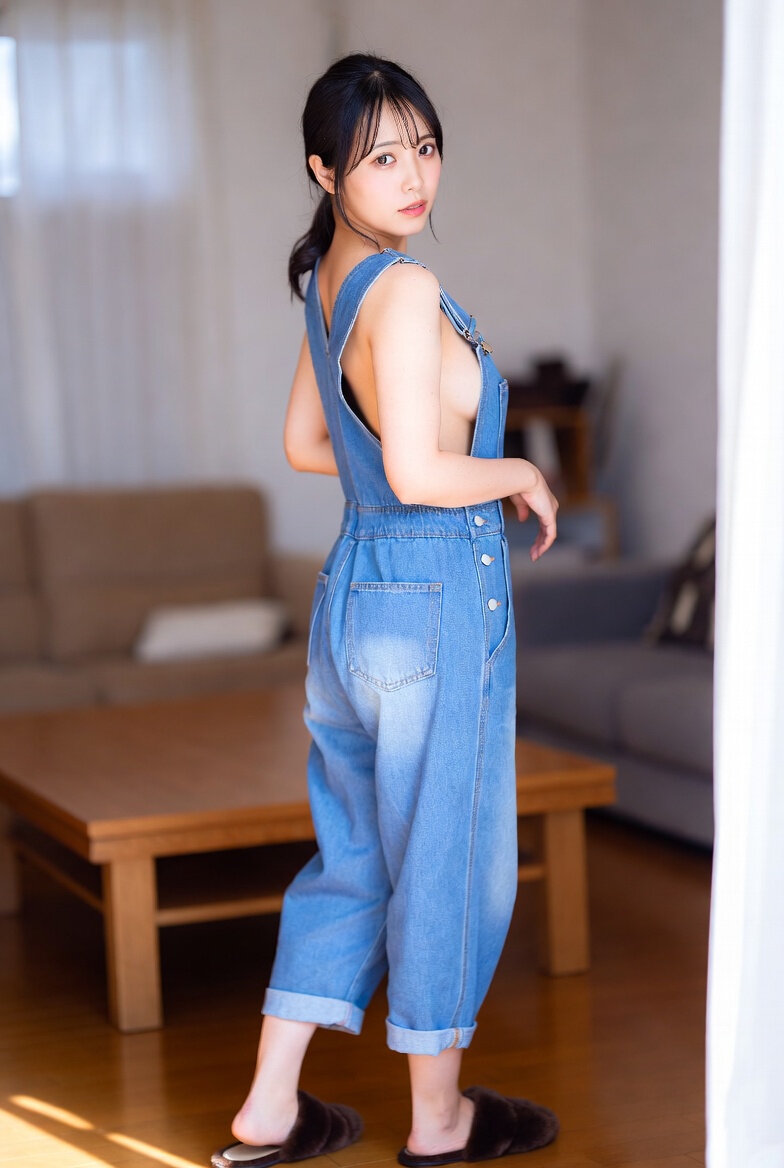 A 25-year-old Japanese woman wearing denim overalls and slippers, looking at the camera. The background is a living room. The photo is taken from a slightly angled back side by a professional photographer.
