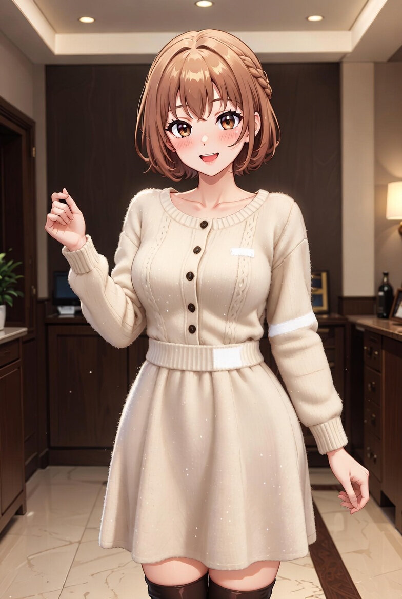 cute anime girl with short brown hair tied in a small braid on the side, big sparkling brown eyes, happy open-mouth smile with blush on cheeks, her large breasts, 軽いメイク、遊び心のある可愛い表情で微笑む、フルボディ、高級ホテルのロビーが背景。ライトベージュのニットカーディガンワンピースを着用、長袖、ボタンダウン前端、小さなボタン、胸ポケット、白いトリムが袖口・襟・ウエストにアクセント、テクスチャードニット生地に微かなラメ、ボディフィットからフレアAラインのミディ丈スカート(ふくらはぎ中間まで)。ダークブラウンのレザー膝丈ブーツ(ヒール付き)を合わせる。一方の手は優雅に上げ、もう一方はリラックス、軽くスカートが広がるポーズ。