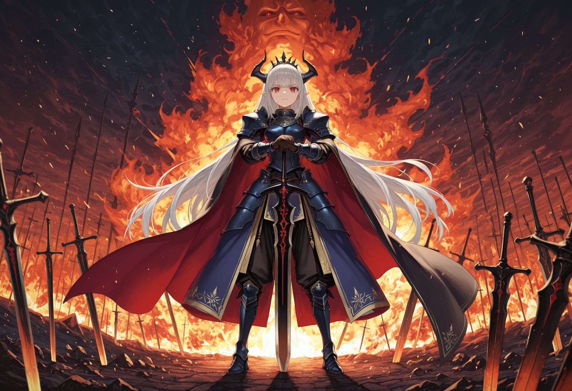 masterpiece,best quality,highres,ultra detailed,highly detailed,8k,general,1girl,solo,17yo,((planted sword, hands on sword),huge sword:1.2),(black demon horns,black dragon horns,silver hair, very long hair,bangs, red eyes),cute girl,slender,long sleeves that cover wrists,medium breasts,dragon girl,dragon ears,pointy ears,light smile,angry,closed mouth,(full armor,shoulder armor,armored dress,gloves,very long loyal king gown,very long loyal king cape,very long loyal king black shirt,tiara,long pants,loose fitting pants),armored boots,slender girl,huge fire background,outdoors,fantasy,front view,