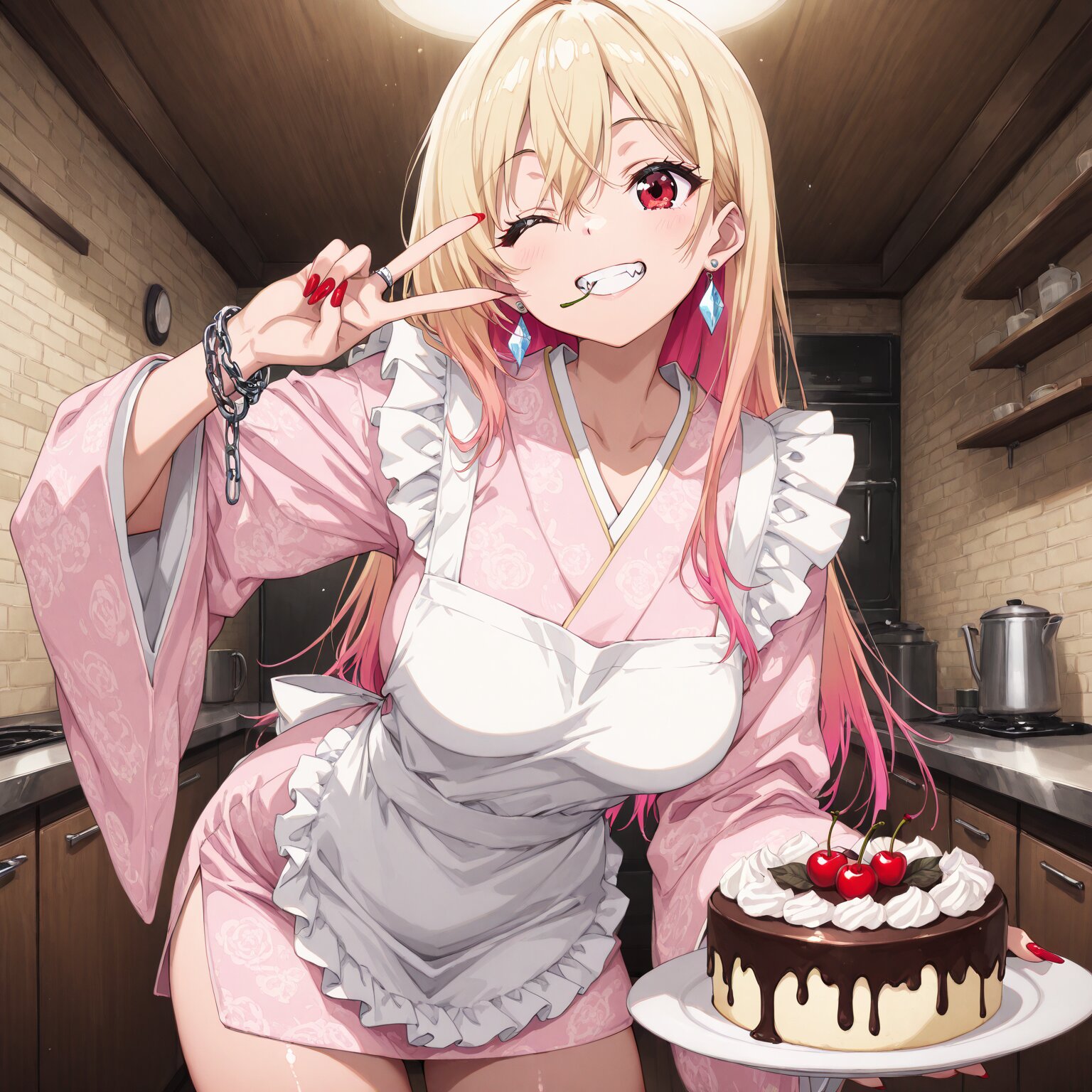 (1girl), young female, BREAK, Blonde, (long hair:1.2), (Straight Hair:1.3), (sharp bangs:1.3), (long bangs:1.2), Long sideburns, (pink inner hair), (gradient hair from blond to pink:1.3) BREAK, red eyes, slanted eyes, Highlights, beautiful eyes, beautiful pupils BREAK, slender, shiny body, shiny skin, (full breasts:1.3), Tight, tight waist, toned body, narrow waist, athletic body, (muscular abs, abs:0.8), muscular BREAK, ((diamond-shaped earrings)), chain belts, chains, chain accessories, Chain bracelet, ring, , fangs, Long nails, red nail polish, gorgeous nail polish, pink kimono, Pink to black gradation kimono, (gold pattern, gold pattern), (apron), big sleeves, puffy sleeves, short kimono bare legs fruit cake, holding cake on a plate in one hand, Peace sign, V, grin, Cherry in mouth, Wink, (one eye closed) Coffee shop interior, retro, Western style. BREAK, (newest, anime, animation, anime screen capture, anime style:1.3) BREAK, (masterpiece, , vibrant, very aesthetic, highly detailed, best quality, 16k:1.3)