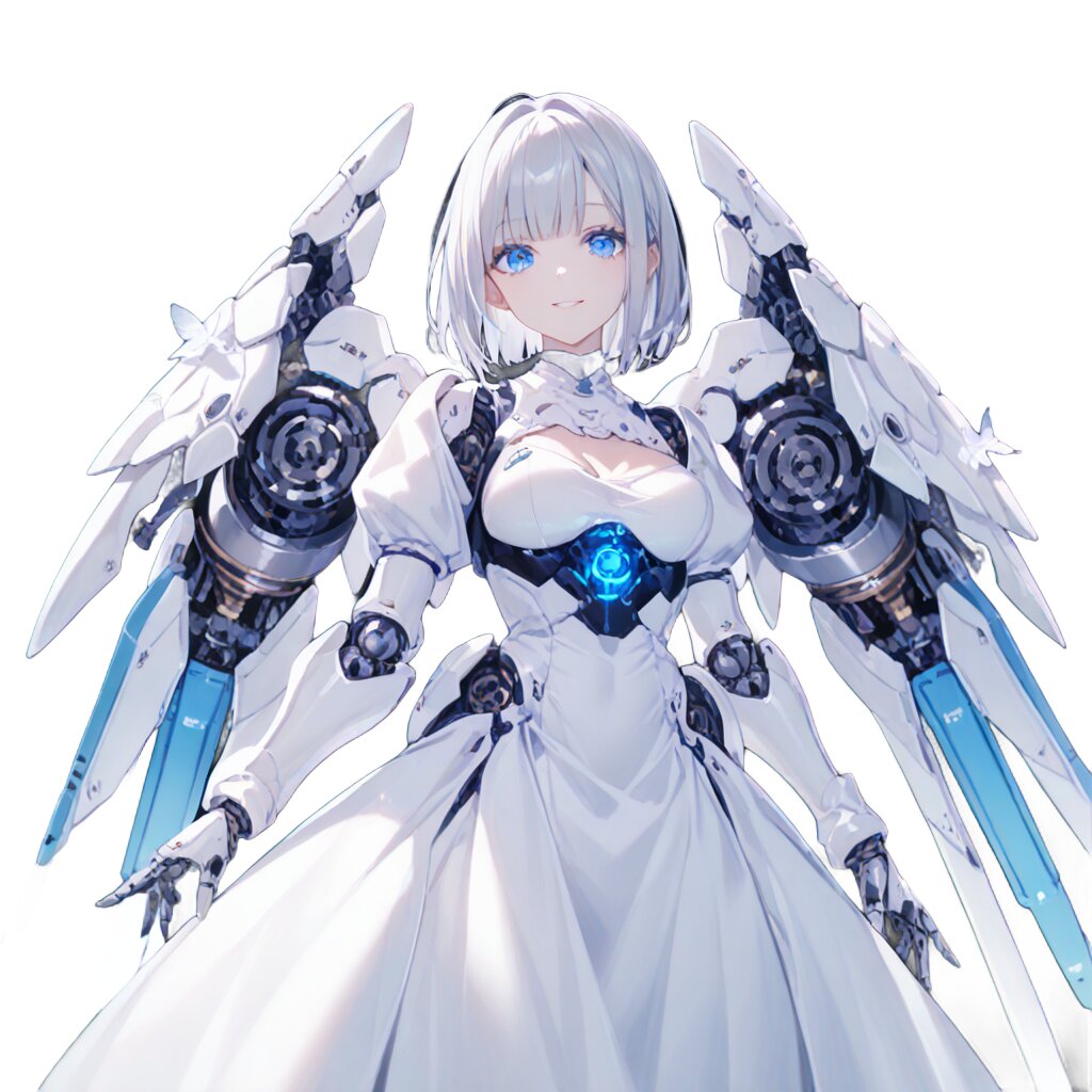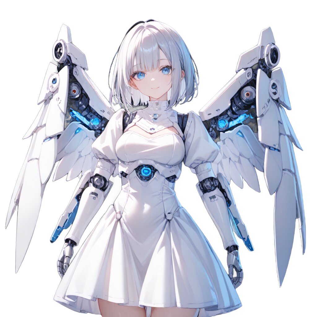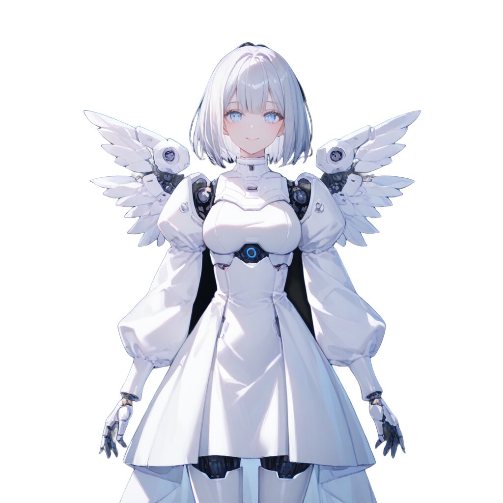 score_9, score_8_up, score_7_up, score_6_up, score_5_up, score_4_up, rating_safe, source_illustration, simple background, black background, 1girl, solo, standing, (25 years old:1), (medium breasts:1), silver hair, short hair, (straight hair:1.2), beautiful detailed eyes, (clear blue small eyes:1.1), (cybernetic gynoid:1.2), (mech suit:1.2), white gothic cuirass, (doll joints:1.2), (white gorgeous modest wizard's short dress skirt:1), (Decorative embroidery:1), (white gorgeous magical design modest dress:1), puff sleeves, (A pair of angel feather small wings on her back:1), bowed wings, small wings, soft smile, lighting forward, front lighting, studio softbox lighting, medium shot, front view, looking at viewer, full shot
