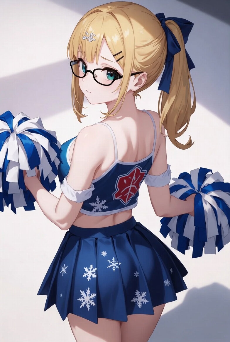 イラスト: A 18-year-old Japanese woman cheerleader, wearing a uniform with 日本の雪をモチーフにしたユニフォーム, holding pom-poms in both hands. Character: A woman with pale skin and vertical gradient eyes shifting from deep blue to sky blue. Her pale nape is exposed, and a few loose strands of hair add a subtle sensuality. She is wearing a white camisole and slim-rim glasses. hair style :ponytail with navy ribbon. A hair pin is held front of head. 背中側斜め後ろからへの構図。カメラ目線。
