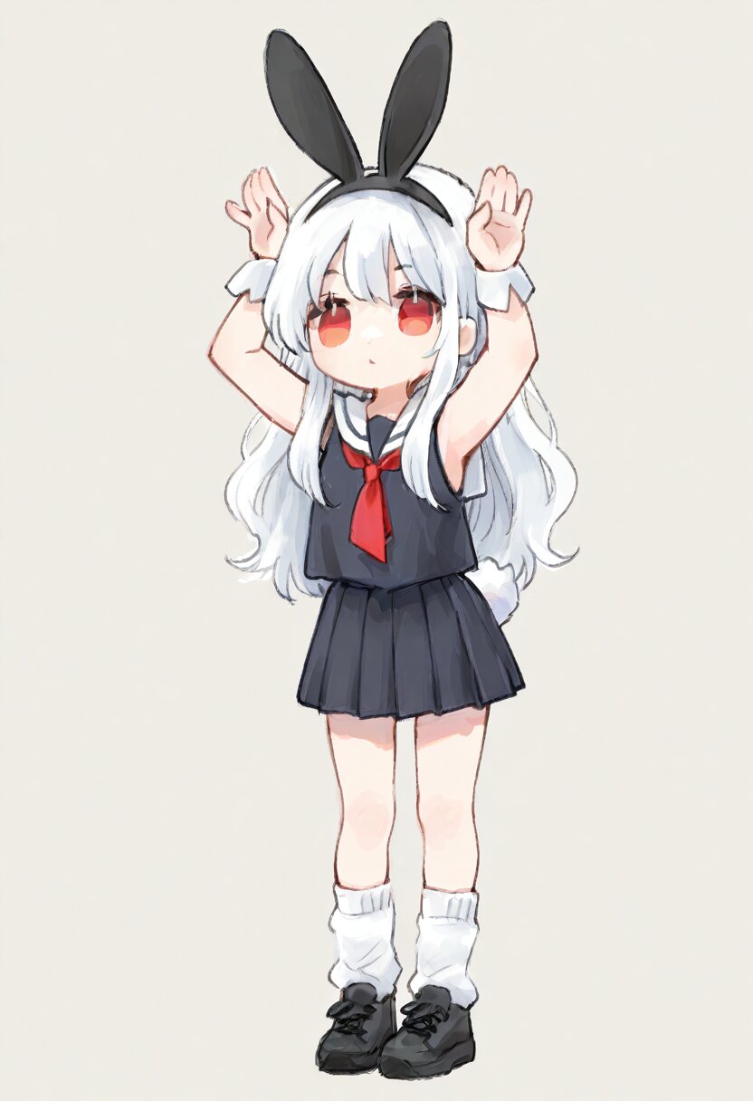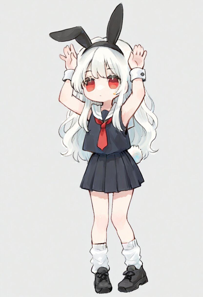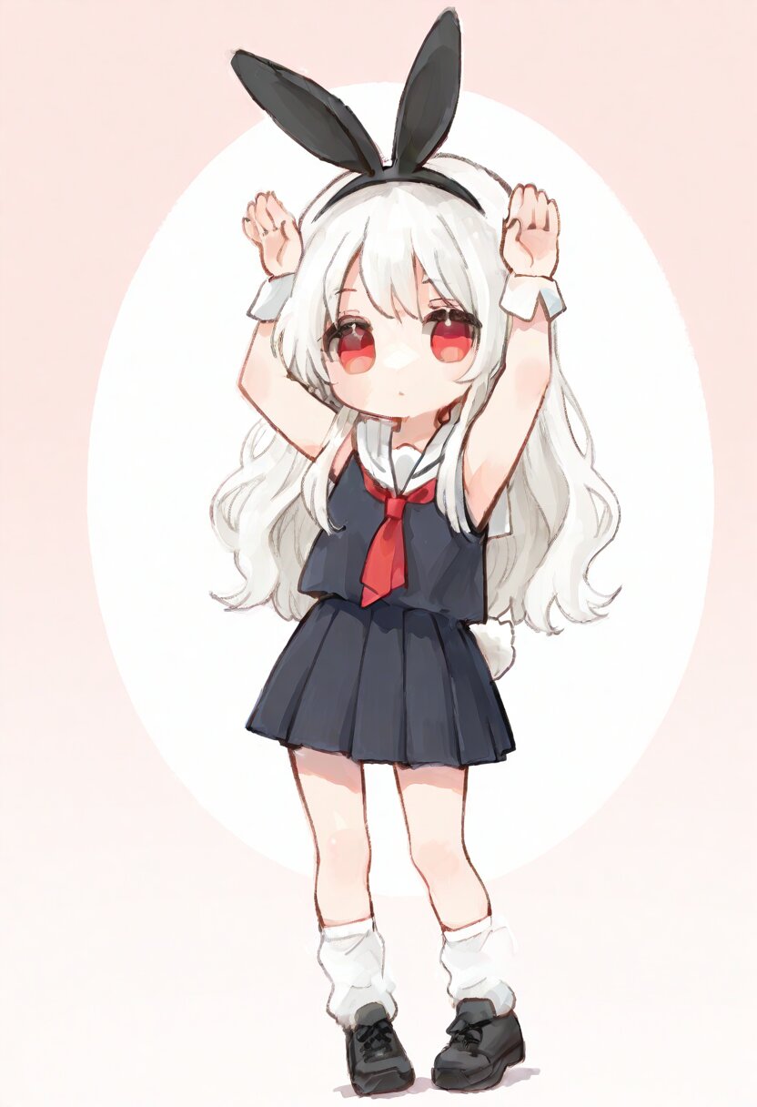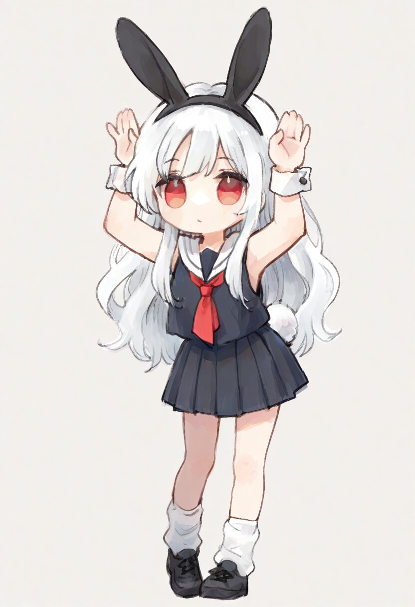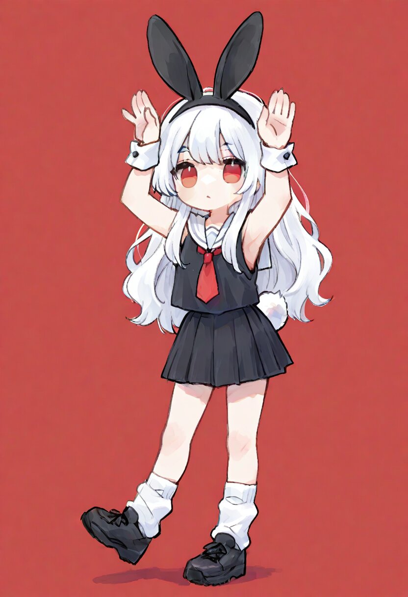 ultra-detailed, best quality, masterpiece, very aesthetic, watercolor painting, general, chibi, solo, 1girl, white hair, long hair, wavy hair, red eyes, rabbit pose, standing, black rabbit ears headband, white rabbit tail, white sailor collar, black tops, red tie, sleeveless, white cuff, black pleats skirt, mini skirt, loose socks, black sneaker, thick soles, <lora:inmnstyleilxl:0.9>