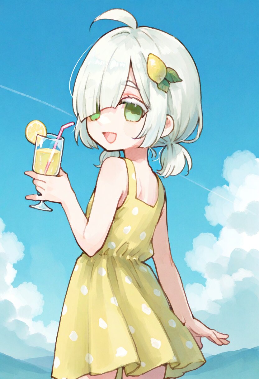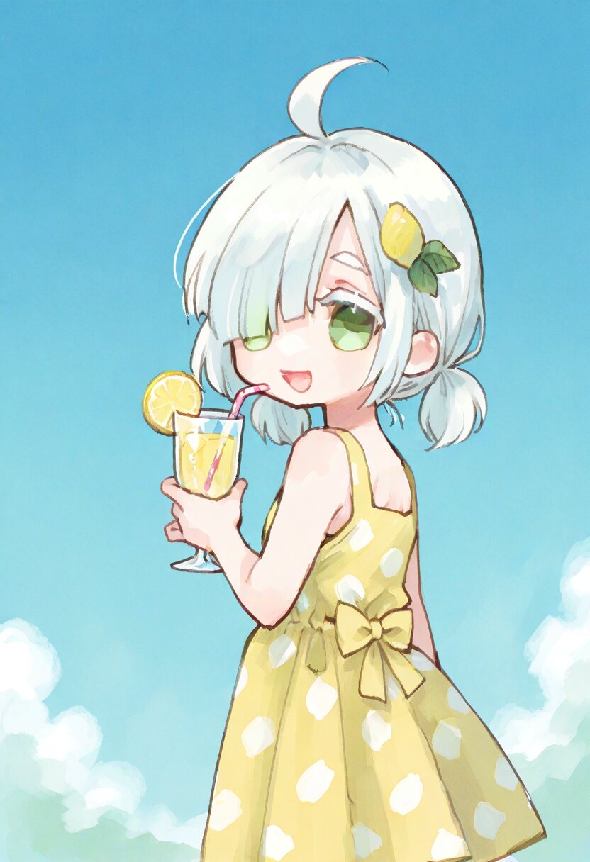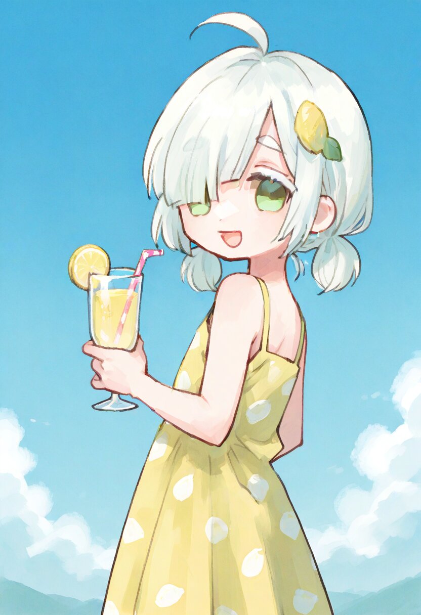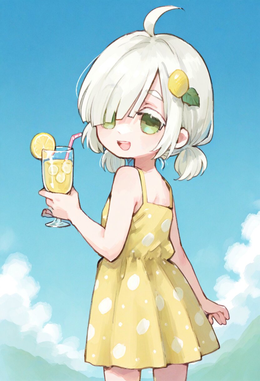 <lora:inmnstyleilxl:0.9> , ultra-detailed, best quality, masterpiece, very aesthetic, watercolor painting, general, chibi, solo, 1girl, yellow sundress, polka dot dress, holding a glass of lemonade, look back, looking at viewer, bast shot, lemon hair ornament, blue sky, (bright white hair), short hair, short low pigtails, blunt bangs, white thick eyebrow, white colored eyelashes, (hair over one eye), ahoge, mint green eyes, smile, open mouth