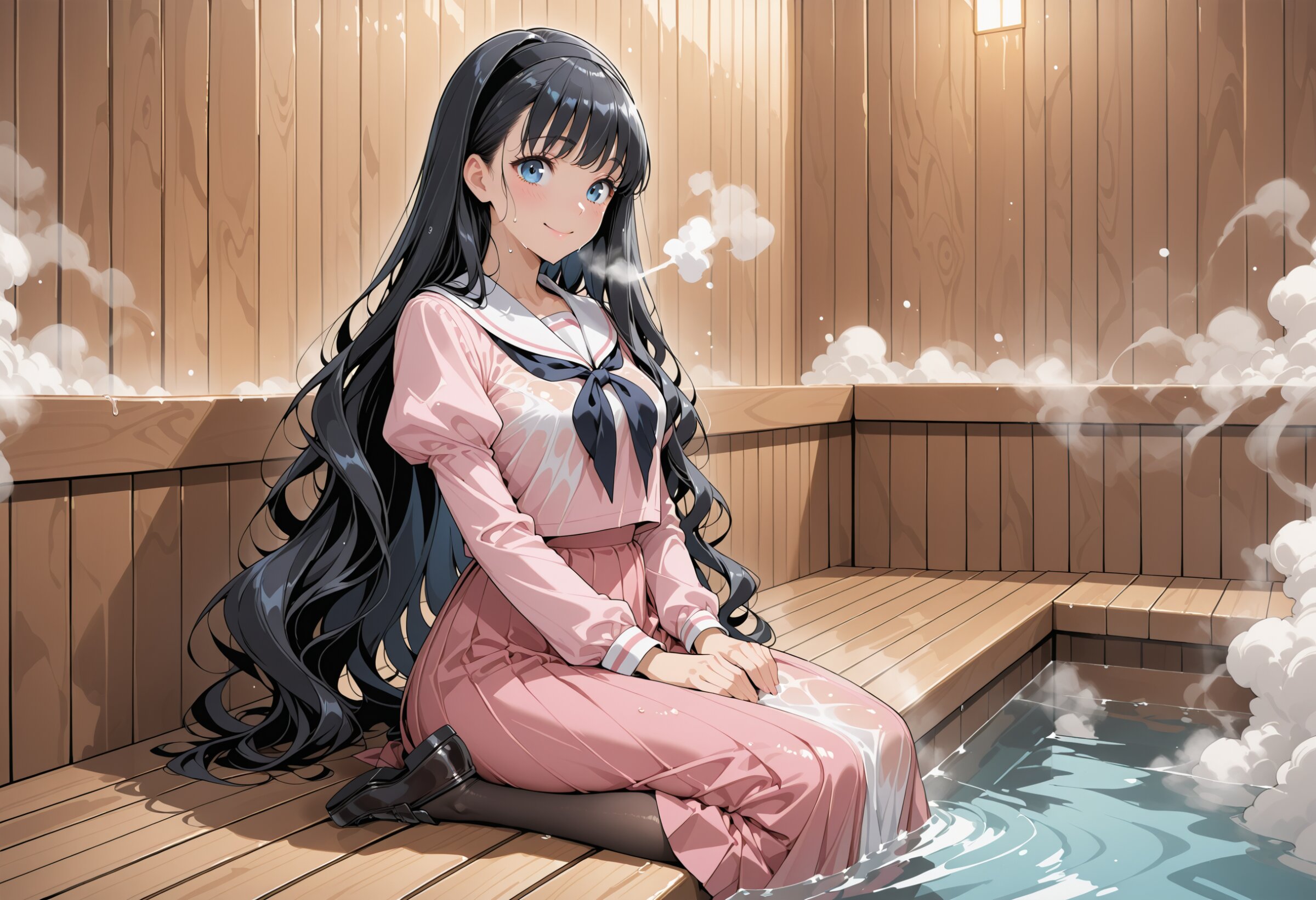 High resolution, Super detailed, Best Quality, masterpiece, 8K, 4K, beautiful background, the best aesthetics, BREAK 1 girl, waguri kaoruko, blue eyes, black hair, very long hair, wavy hair, black hairband, pink shirt, juliet sleeves, white serafuku, pink skirt, long skirt,black loafers, black ribbon,pantyhose,smile,wet clothes,wet hair,wet skin, full clothes,sitting in seiza wear black loafers, BREAK sauna room, shoulders submerged fill body in surface of the water, ,heavy fog,hot steam,fall into hot water,