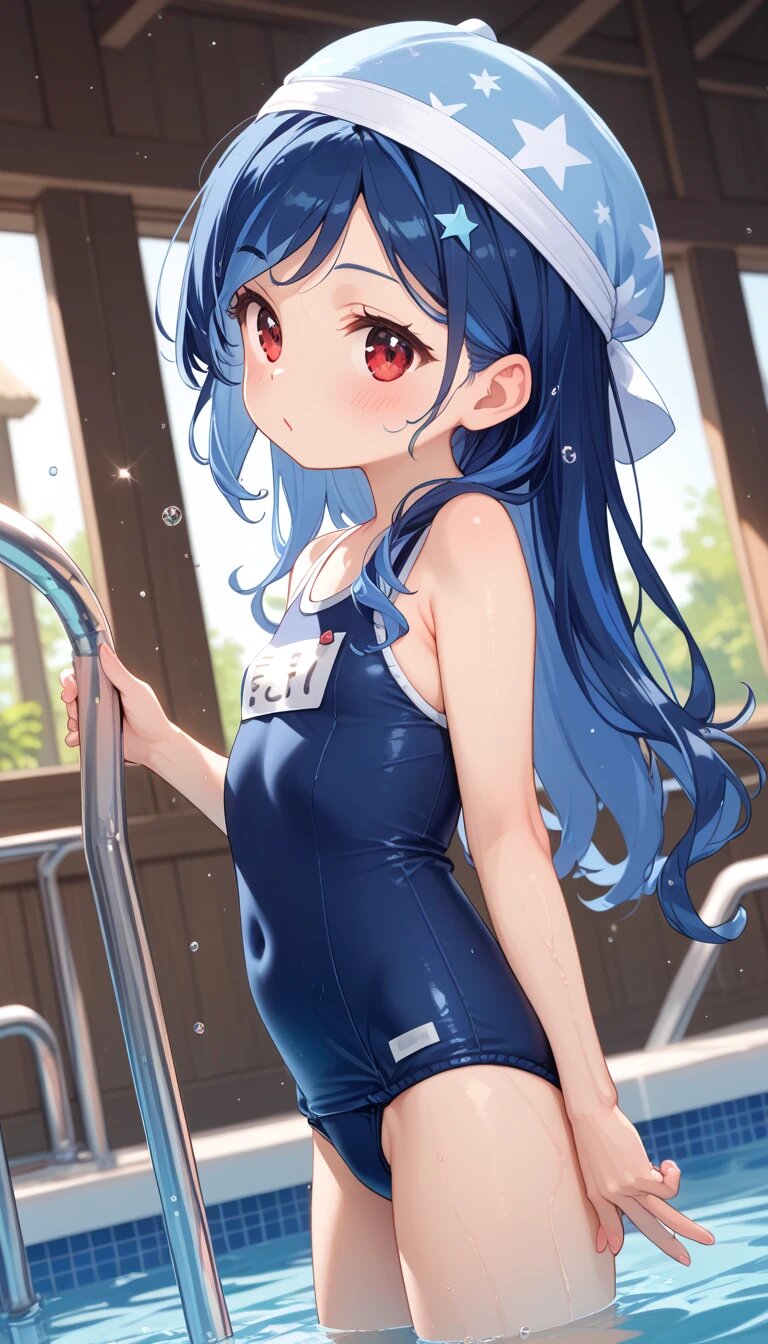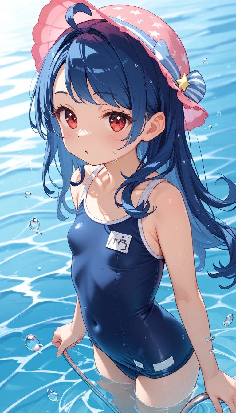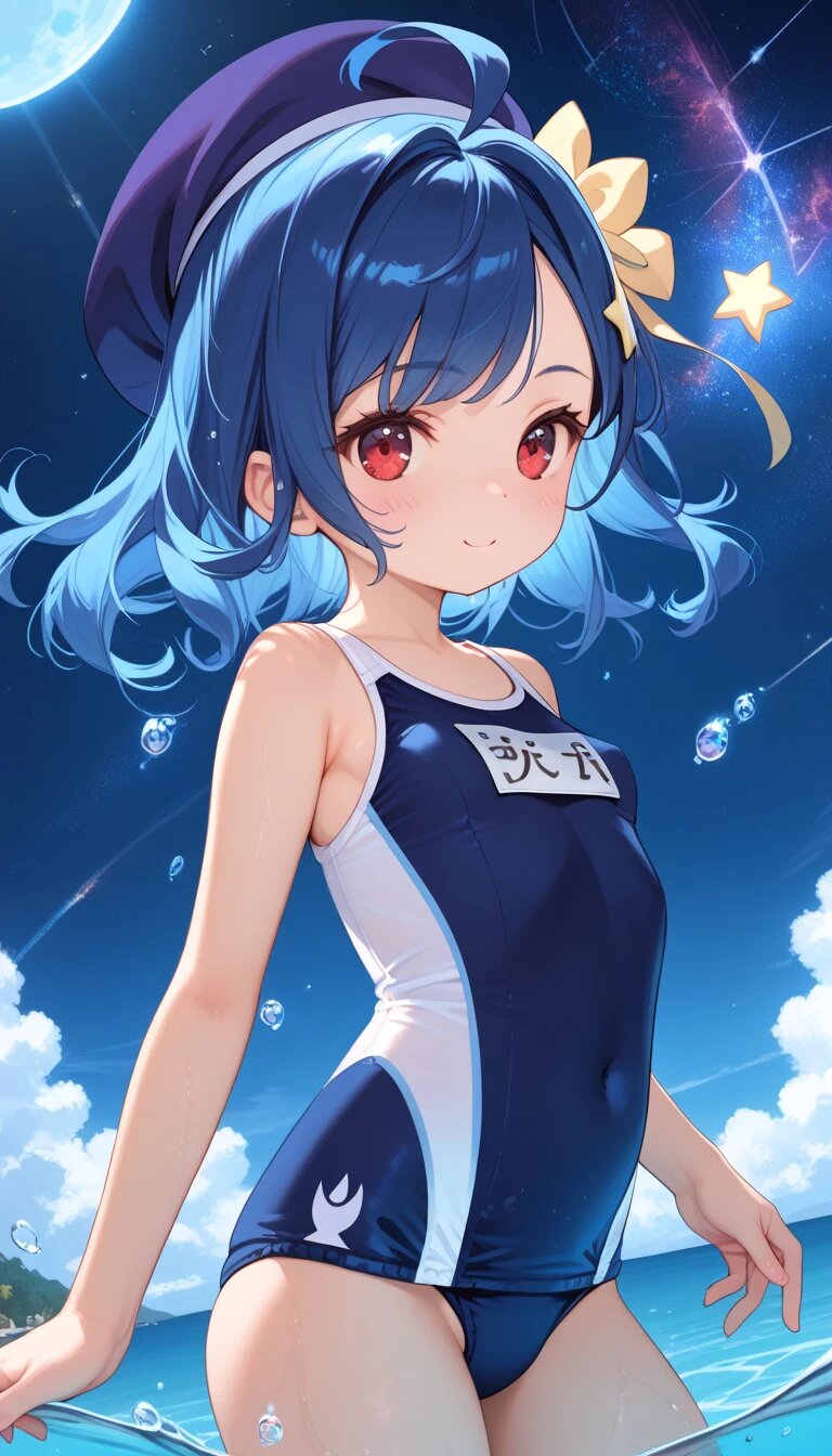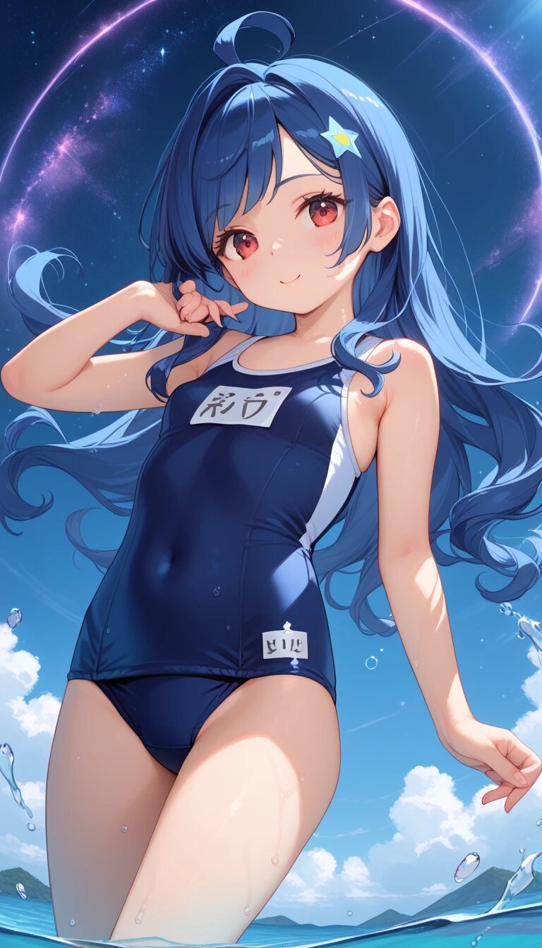 1girl, A person swimming the crawl stroke in the Milky Way, starry night sky, fantasy, ethereal, glowing stars, deep blue and purple colors, realistic, high detail, Water droplets become stars, blue hair, red eyes, long hair, heart ahoge, height 152cm, small breasts,cute,old school swimsuit,A name tag on the chest bearing the Japanese characters for 'あおこ',silicone swim cap, masterpiece, top quality, highly aesthetic, absolute resolution, ultra-detailed, perfect composition,striking,