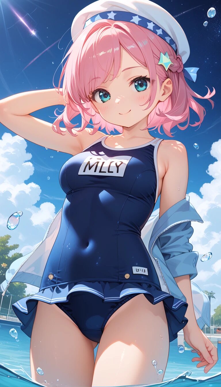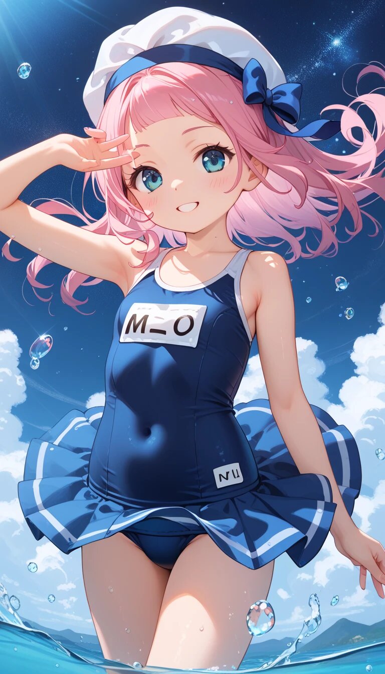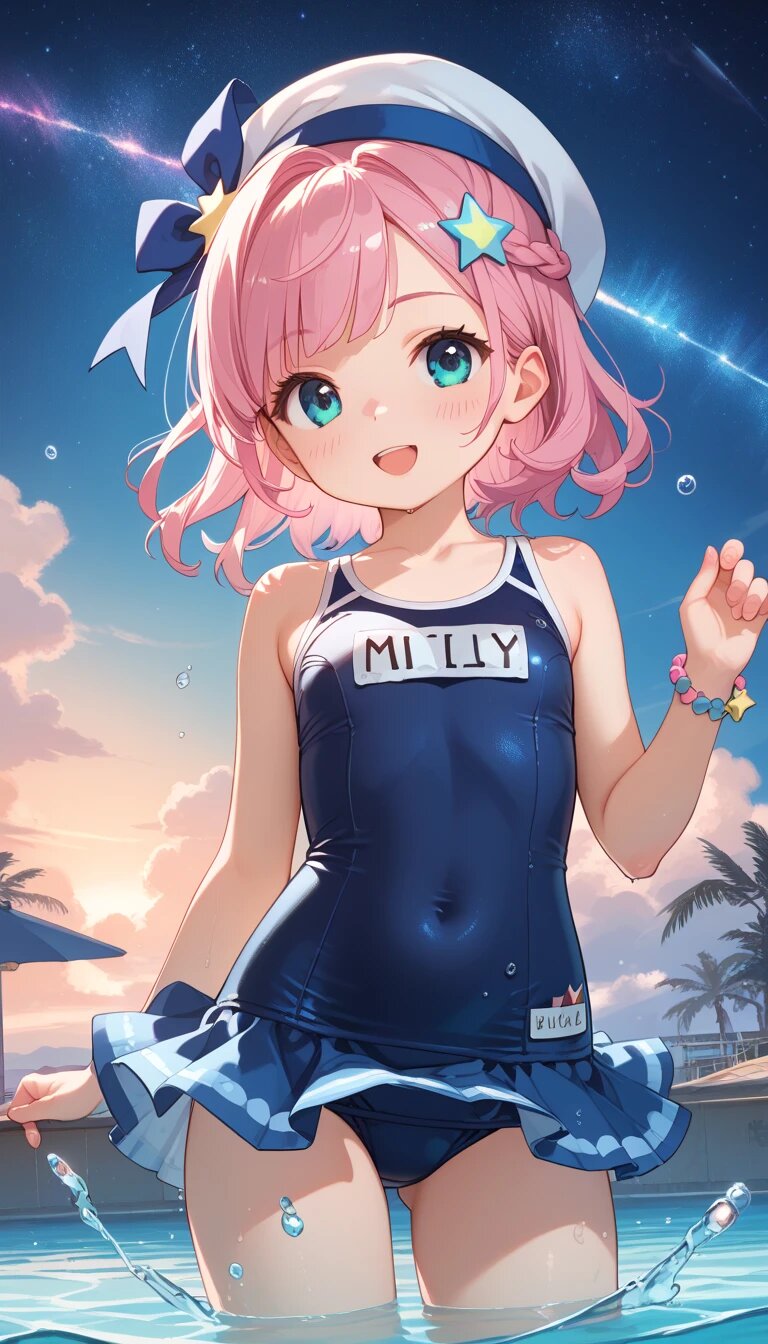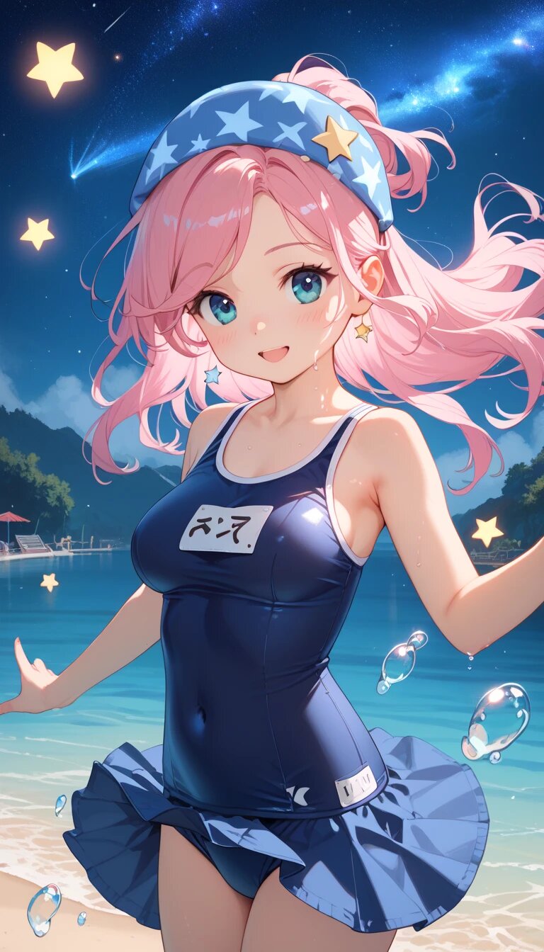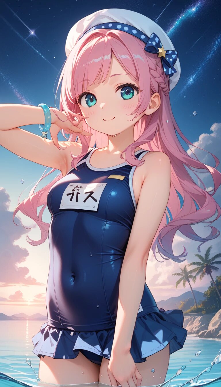 1girl, A person swimming the crawl stroke in the Milky Way, starry night sky, fantasy, ethereal, glowing stars, deep blue and purple colors, realistic, high detail, Water droplets become stars, blue hair, red eyes, long hair, heart ahoge, height 152cm, small breasts,cute,old school swimsuit,A name tag on the chest bearing the Japanese characters for 'あおこ',silicone swim cap, masterpiece, top quality, highly aesthetic, absolute resolution, ultra-detailed, perfect composition,striking,