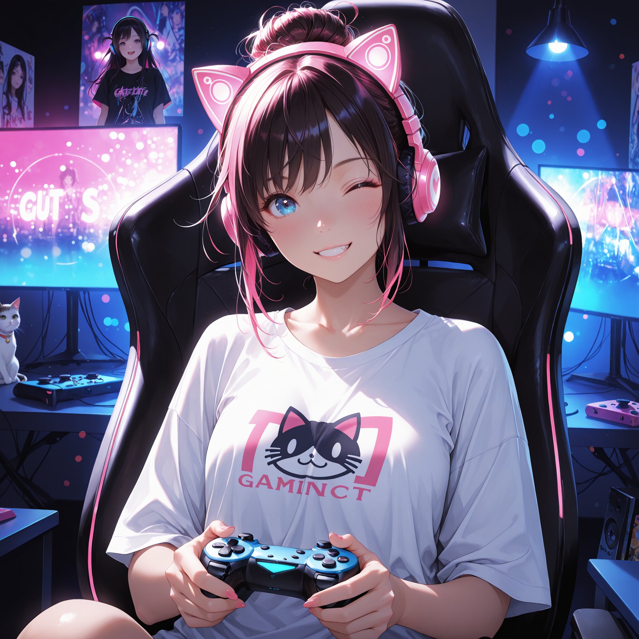 masterpiece, best quality, photorealistic, sharp focus, cinematic lighting, depth of field, beautiful composition, vibrant colors, ultra high res, 8K, highly detailed, masterpiece, best quality, very detailed, (masterpiece:1.2), (best quality), (ultra-detailed), 1girl, solo, stylish and cute girl, messy bun hair, wearing cat-ear headphones, oversized t-shirt, holding a cute controller or snacks, sitting in a gaming room with neon pink and blue RGB lighting, posters and figurines in background, looking over shoulder with a playful wink, vibrant colors, cinematic bokeh, aesthetic lighting, high contrast, trendy anime style, masterpiece composition.