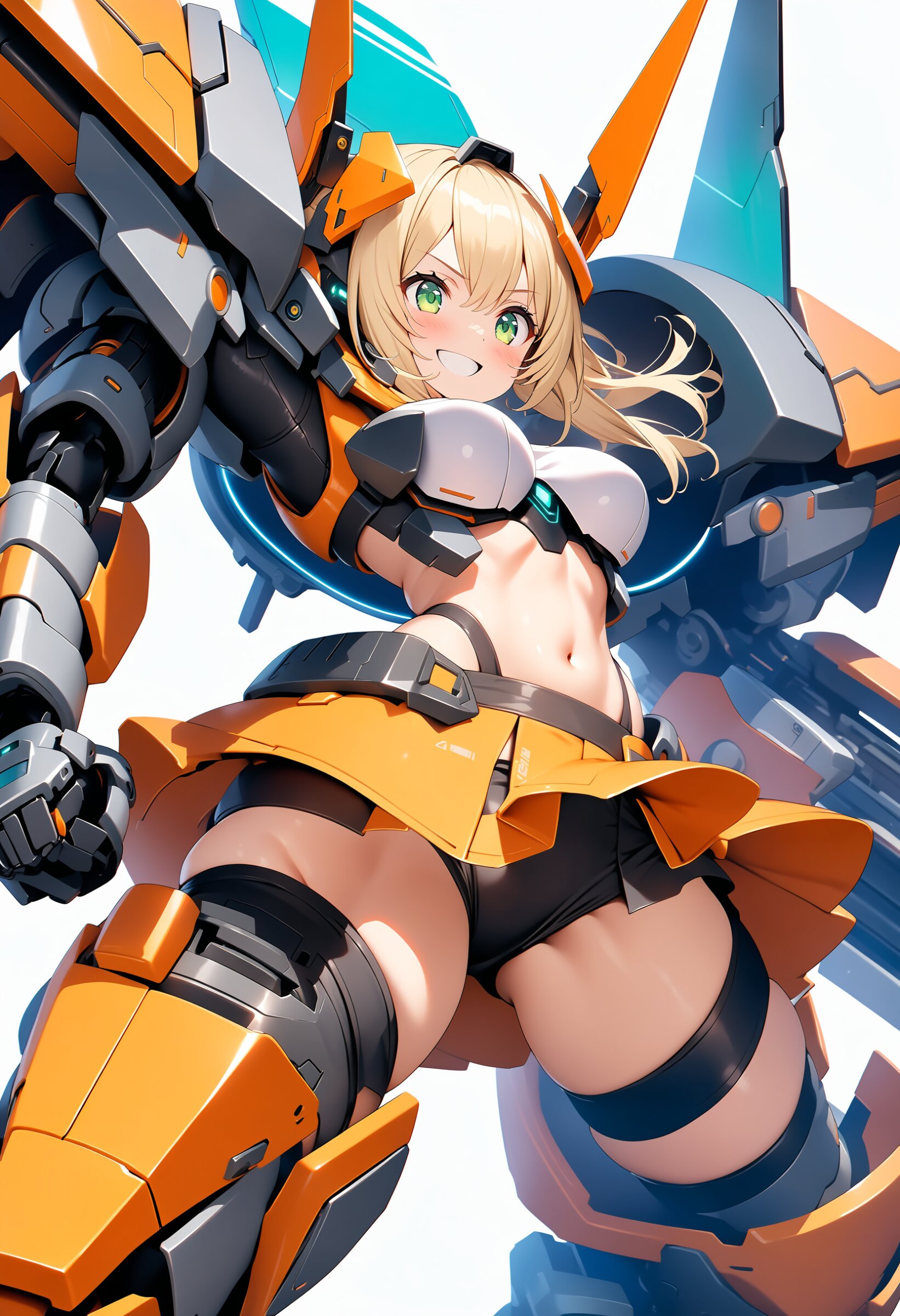 1girl, ((white background)), ultra detailed 8k cg render, masterpiece, high resolution, extremely detailed, mecha musume,mecha shoulder, mech leg, headgear, mecha armor, ((mini skirt)),long blonde hair, dropping green eyes, smile, dynamic posing,