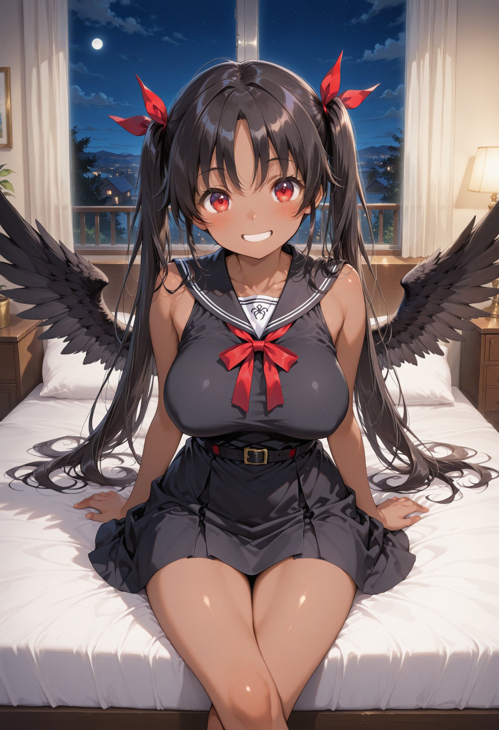 masterpiece, best quality, amazing quality, general, fine detail, official art, 1girl, dark skin, loli, black hair, long hair, side twin tail, red ribbon, (black sailor dress:1.2), white sailor tie, very short, skirt, sleeveless, big breasts, (perky breasts), big black wings, grin, night, dark room, on bed, sitting cross legged, look at viewer,