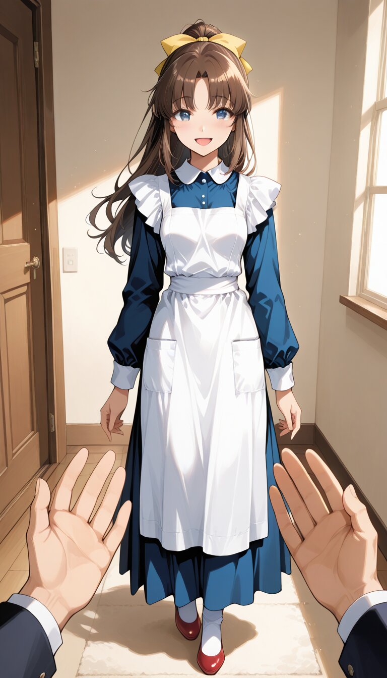 masterpiece,best quality,amazing quality,general, fine detail, official art, 1girl, cute face, brown hair, long hair, ponytail, navy eyes, large expressive eyes, (beautiful eyes), small breasts, blue dress, long sleeves, long skirt, white apron, white socks, red shoes, yellow bow, ((full body)), slightly open mouth, bangs, close-up portrait, shy seductive expression, detailed face, delicate skin texture, extremely detailed, soft shadows, masterpiece, best quality, 8k, raw photo, {Photorealistic}, detailed skin, detailed face, extremely beautiful face, 1girl, solo, smile, looking at viewer, solo focus, pov, greeting, ((nice hands, perfect hands)), feel happy, happy face, delight face, happy,
