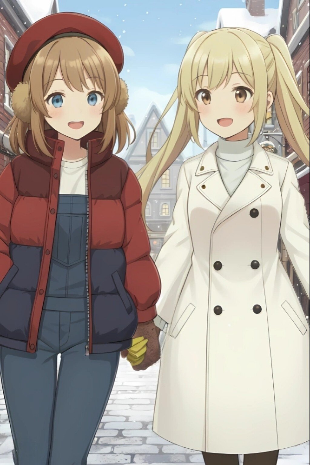 Two anime-style girls are walking hand in hand against the backdrop of a winter cityscape. This illustration has a warm atmosphere, smooth lines, and rich colors. 8K. The girl on the left has brown hair and blue eyes and wears a red beret and earmuffs, a red and navy blue down jacket, and blue overalls. The girl on the right has blonde hair and brown eyes and wears a white turtleneck and white coat. Both are smiling and looking happy as they walk through the falling snow.