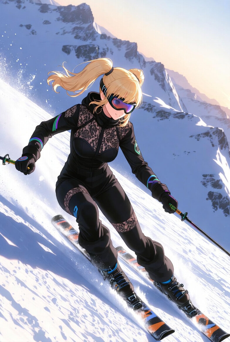 An illustration of a Ani, the companion by xAI.アルペンスキーのように急斜面を高速で滑走しているシーン。Aniの黒いレースをモチーフにしたスキーウェアでカラフルな差し色がアクセント。雪のスプレー、自然光、白銀の山岳背景。