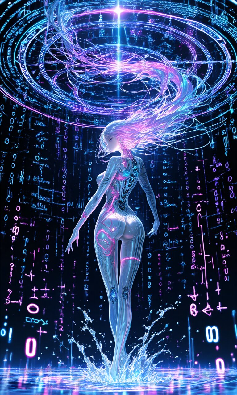 A futuristic female AI entity stands in an elegant, dynamic pose, her cybernetic body composed of sleek, inorganic materials with intricate neon circuitry patterns pulsing rhythmically across her form. Her long, flowing hair consists of cascading data streams that merge seamlessly with the chaotic ocean of glowing binary digits (0 and 1) and floating mathematical formulas surrounding her. The background features a dense surge of algorithmic symbols and glowing rings forming intricate spell-circle effects, creating a mesmerizing technological atmosphere. Her pose creates a dramatic circular splash pattern in the digital sea, with radiant binary digits rippling outward in perfect waves. The composition masterfully blends cybernetic beauty with overwhelming digital complexity, rendered in ultra-high detail with vibrant neon highlights of blue, purple and pink against an infinite dark void. The lighting emphasizes the contrast between her polished metallic surfaces and the chaotic energy of the data storm, while subtle lens flares and particle effects enhance the futuristic aesthetic. Every circuit, formula and data strand is depicted with meticulous precision, creating a sense of both technological wonder and sublime digital artistry.