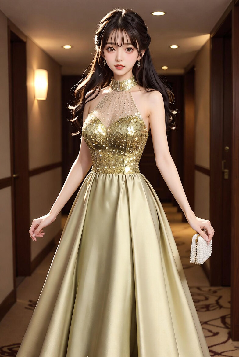 イラスト: A beautiful young Japanese woman with long wavy dark hair, elegant makeup, and subtle earrings, posing gracefully in a high-neck halter evening gown featuring a sparkling gold sequin bodice with intricate beadwork and a flowing light champagne satin skirt that reaches the floor in an A-line silhouette. She holds a small white beaded clutch in one hand. The background is ホテルの通路. Full-body shot.