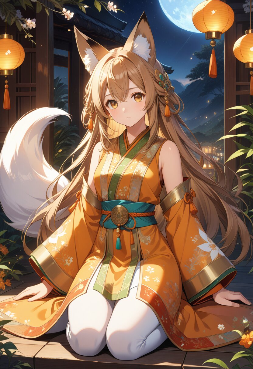 (high resolusion,illustration,ultra detailed 8k art,extremely detailed CG,official art,clothes reflecting light,detailed shiny skin,detailed background:1.3), ((highly detailed beautiful face and eyes),anime_style, fox_ears, girl, light_brown_hair, double_eyelids, long_eyelashes, fluffy_tail, haregi, full_body, elegant_pose, soft_lighting, expressive_eyes, delicate_features, festive_atmosphere, warm_color_palette, charming_scene