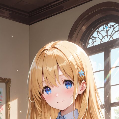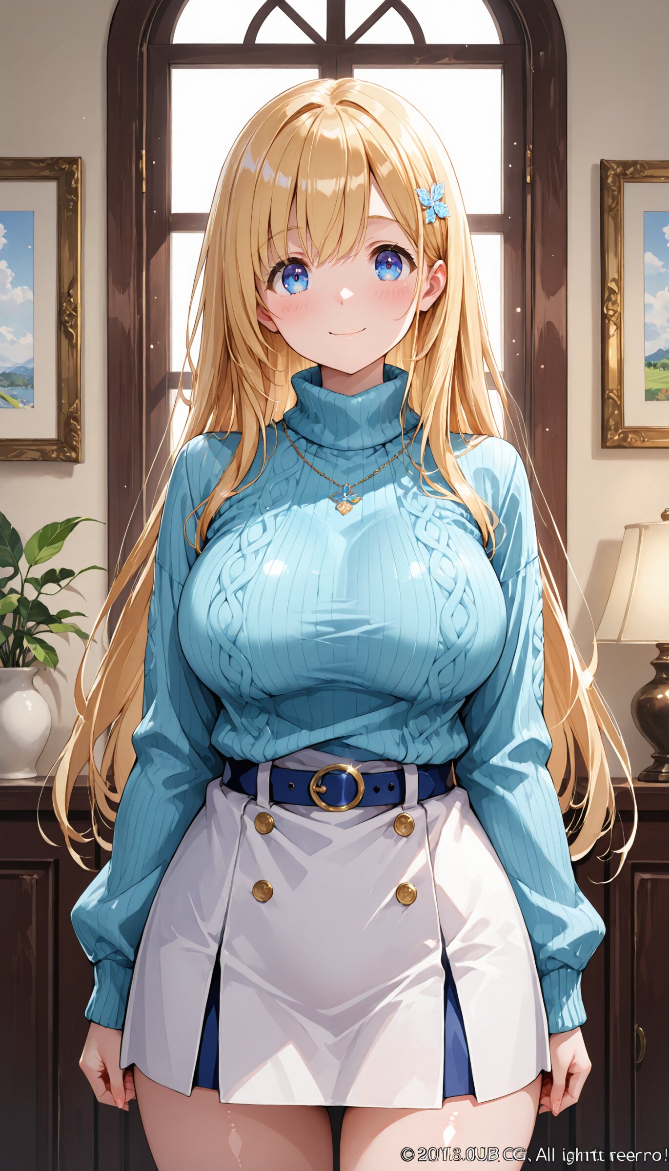 (masterpiece,high resolusion,illustration,ultra detailed 8k art,extremely detailed CG,official art,clothes reflecting light,detailed shiny skin,detailed background:1.3), ((highly detailed beautiful face and eyes)) BREAK 1girl, upper_body, 16-year-old, kawaii, cute_face, tareme, inocent_smile, no_makeup, beautiful_anime_girl, blonde_hair, long_hair, straight_hair, large_breasts, beautiful_breasts, cable-knit sweater, long_sleeves, white_skirt, miniskirt BREAK palace, arched_window, standing,