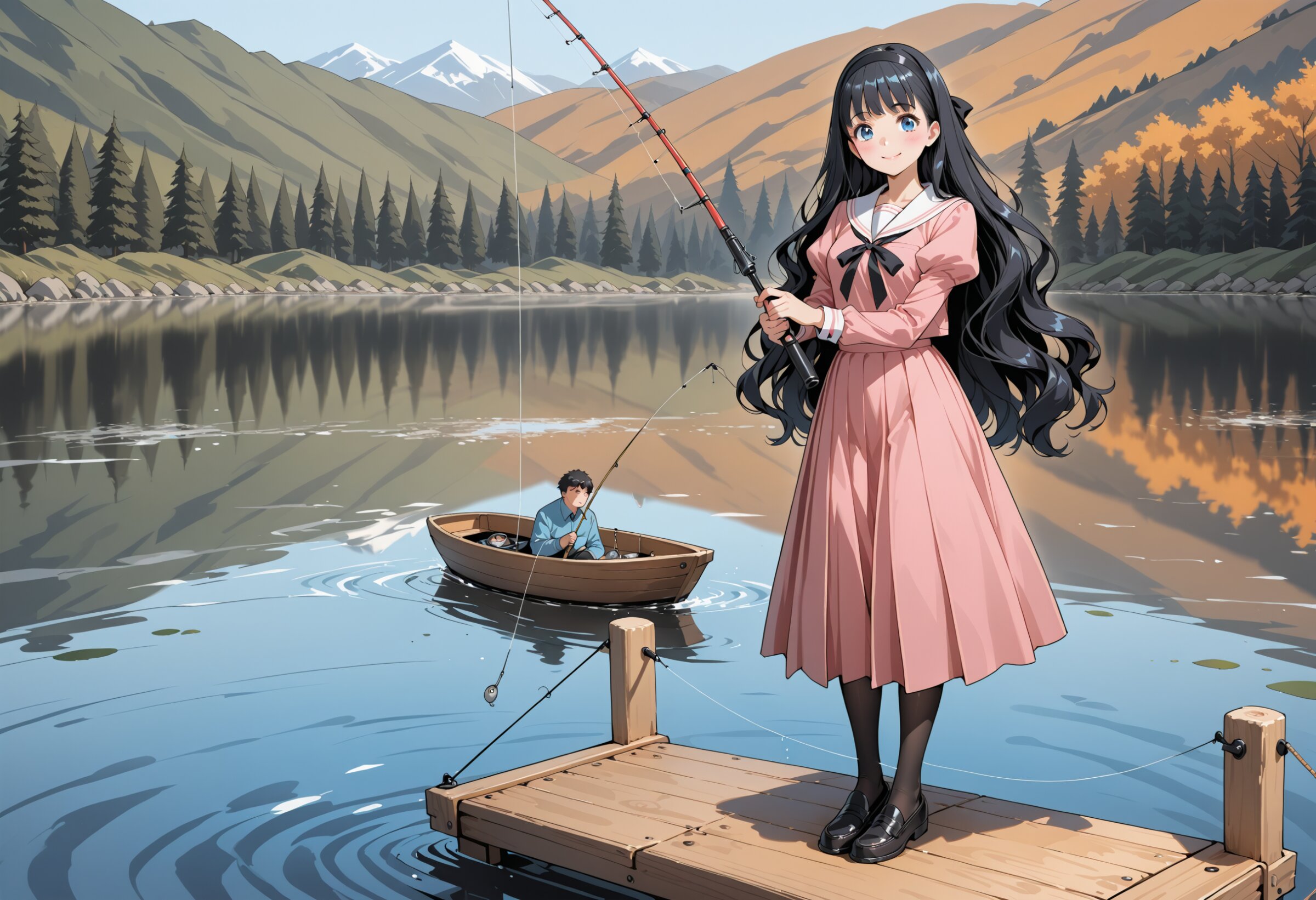 High resolution, Super detailed, Best Quality, masterpiece, 8K, 4K, beautiful background, the best aesthetics, BREAK 1 girl, waguri kaoruko, blue eyes, black hair, very long hair, wavy hair, black hairband, pink shirt, juliet sleeves, white serafuku, pink skirt, long skirt,black loafers, black ribbon,pantyhose,smile,fishing salmon, BREAK wooden boat on the lake,winter fishing date,front view, standing on wooden pier, catching carp with fishing rod, frozen lake surface, romantic mood, fishing tackle,