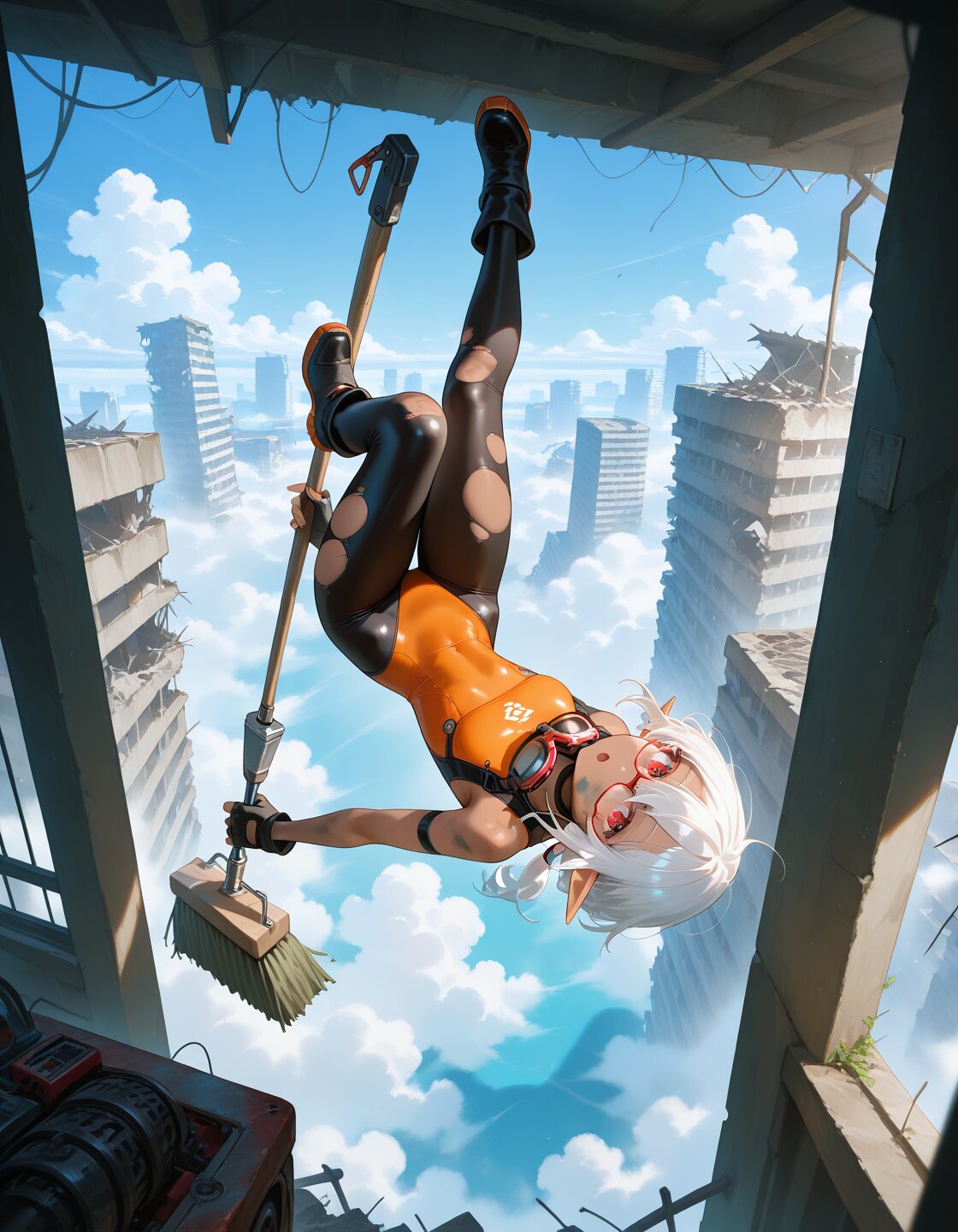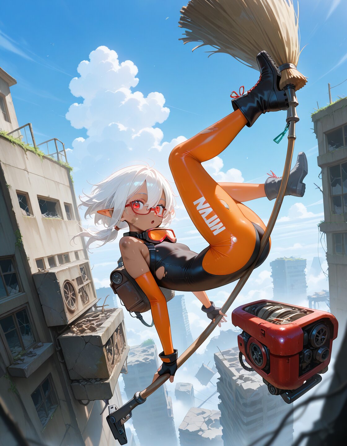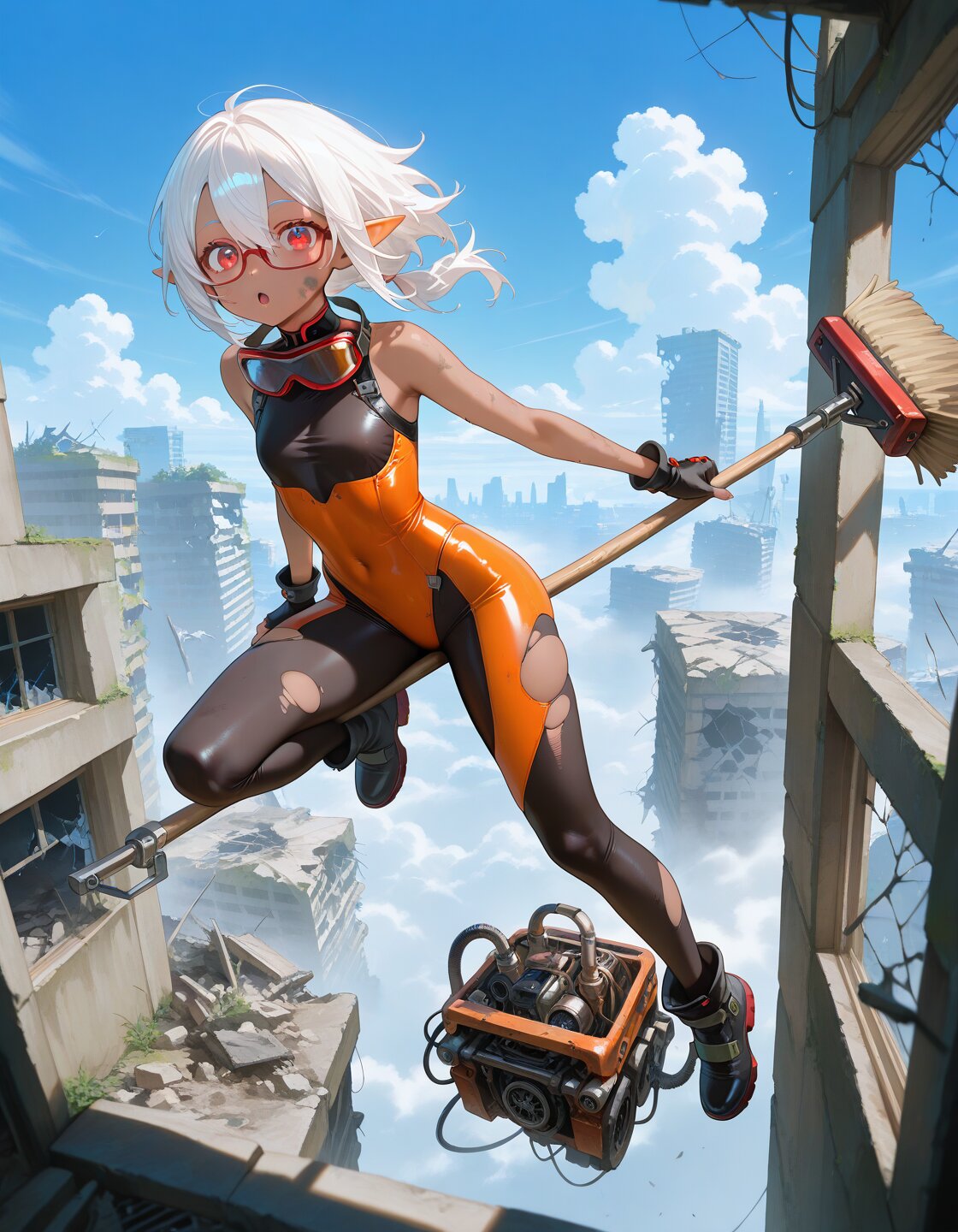 1girl, sensitive, fantasy, cyberpunk, post-apocalypse, scenery, abandoned, floating, (mechanical broom:1.3), (beautiful eyes, detailed eyes), three quarter view, looking at viewer, solo, cute, day, blue sky, wind lift, midair, above cloud, (dark skin, red-framed eyewear:1.2), white hair, low ponytail, medium hair, hair between eyes, flat chest, red eyes, elf, orange bodysuit, black bodysuit, taut bodysuit, torn bodysuit, sleeveless, fingerless gloves, highleg, black ankle boots, goggles on neck, hanging, upside-down, engine, wind, broom riding, broken window, rubble, ruins, :o, dirty face, masterpiece, best quality, amazing quality,