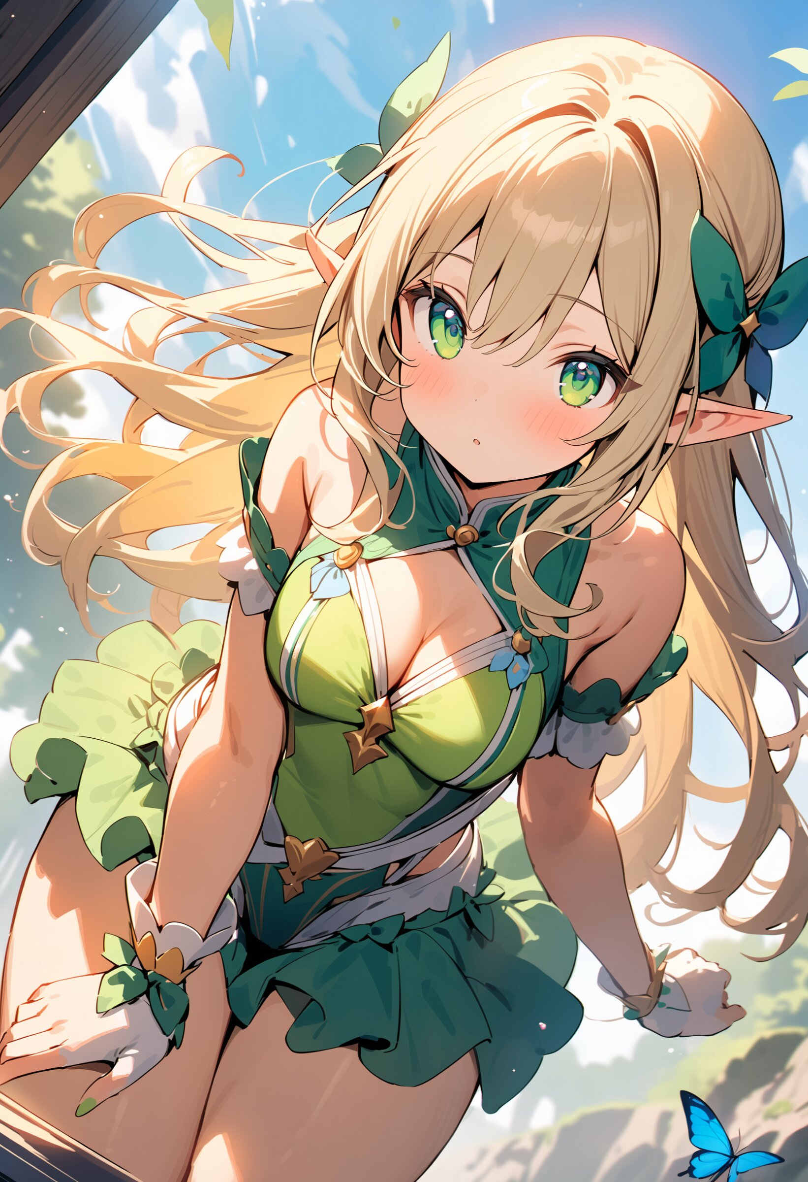 ((masterpiece)), ((best quality)), ((kawaii)), cute, (lovely), ((extremely detailed)), (beautiful), dynamic angle, a cute girl, 1girl, solo, ((elf)),beautiful blond hair, beautiful green eyes, ((beautiful eyes)), long hair, fantasy clothes,
