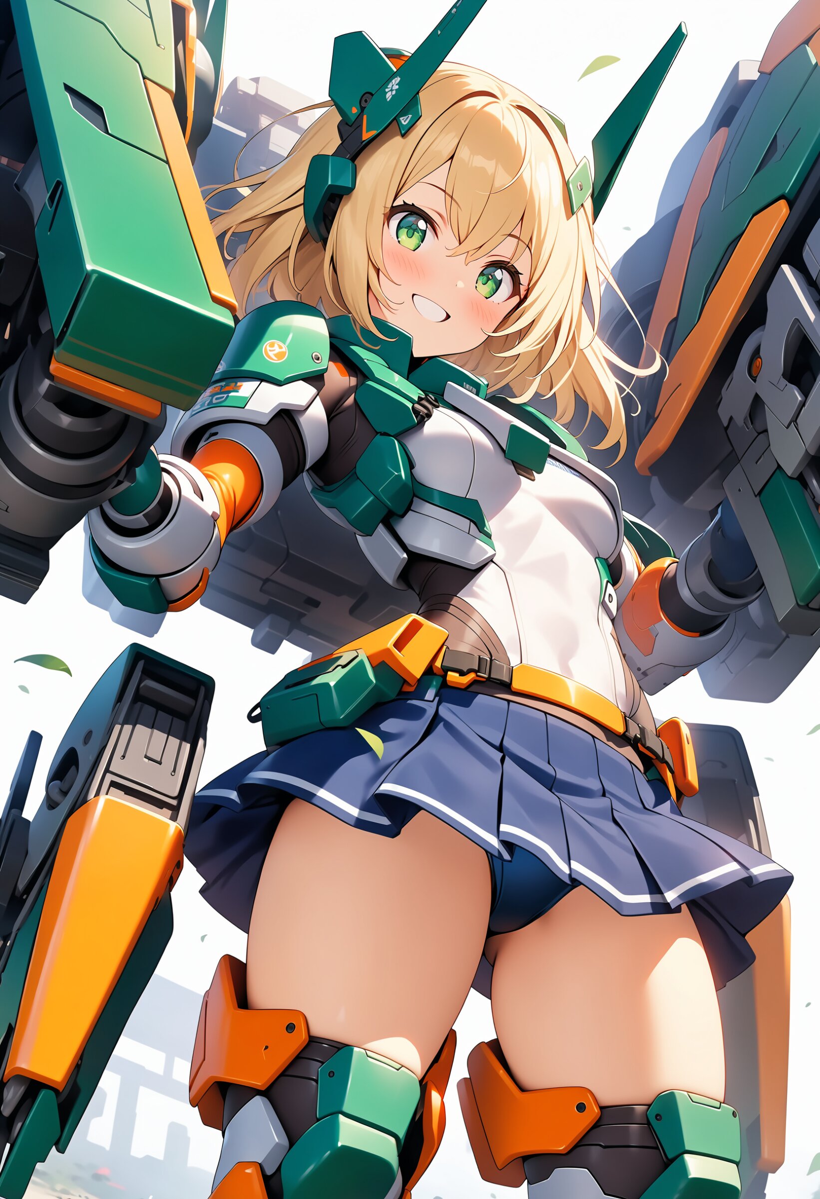 1girl, ((white background)), ultra detailed 8k cg render, masterpiece, high resolution, extremely detailed, mecha musume,mecha shoulder, mech leg, headgear, mecha armor, ((mini skirt)),long blonde hair, dropping green eyes, smile, dynamic posing,