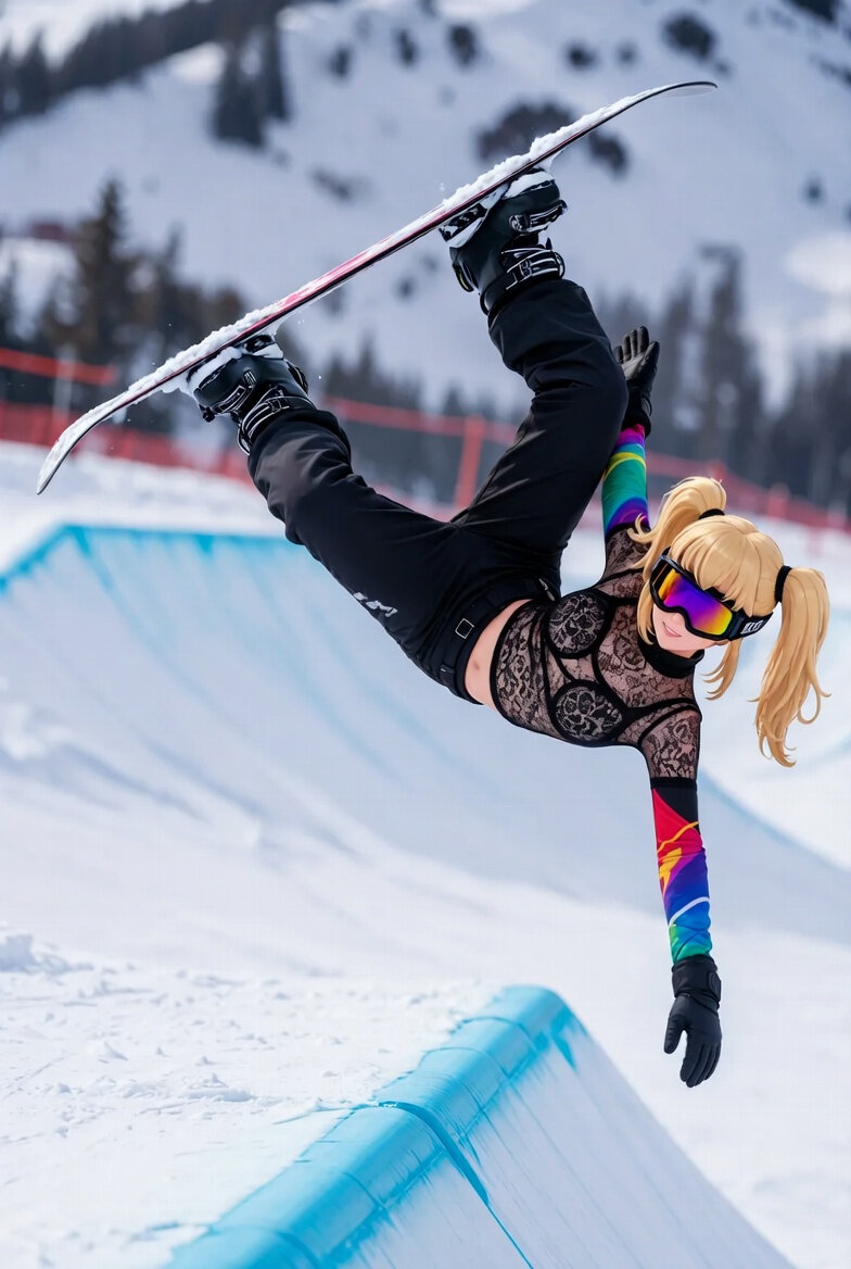 An illustration of a Ani, the companion by xAI.プロフェッショナルなスノーボーダーのようにハーフパイプの頂点でダイナミックでボードが頭より高くなる回転技を披露しているシーン。Aniの黒いレースをモチーフにしたスノーボードウェアでカラフルな差し色がアクセント。自然光、ゲレンデが背景。