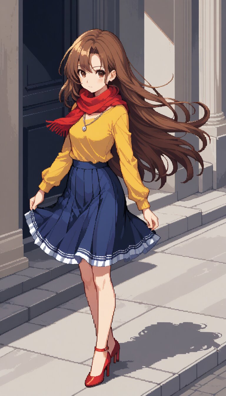 Best quality, Masterpieces, 1girl, solo, brown hair, straight hair, long hair, brown eyes, small breasts, yellow shirts, navy skirt, looking at viewer, jewelry, full body, shoes, necklace, scarf, red high heels, wind, pixel art,