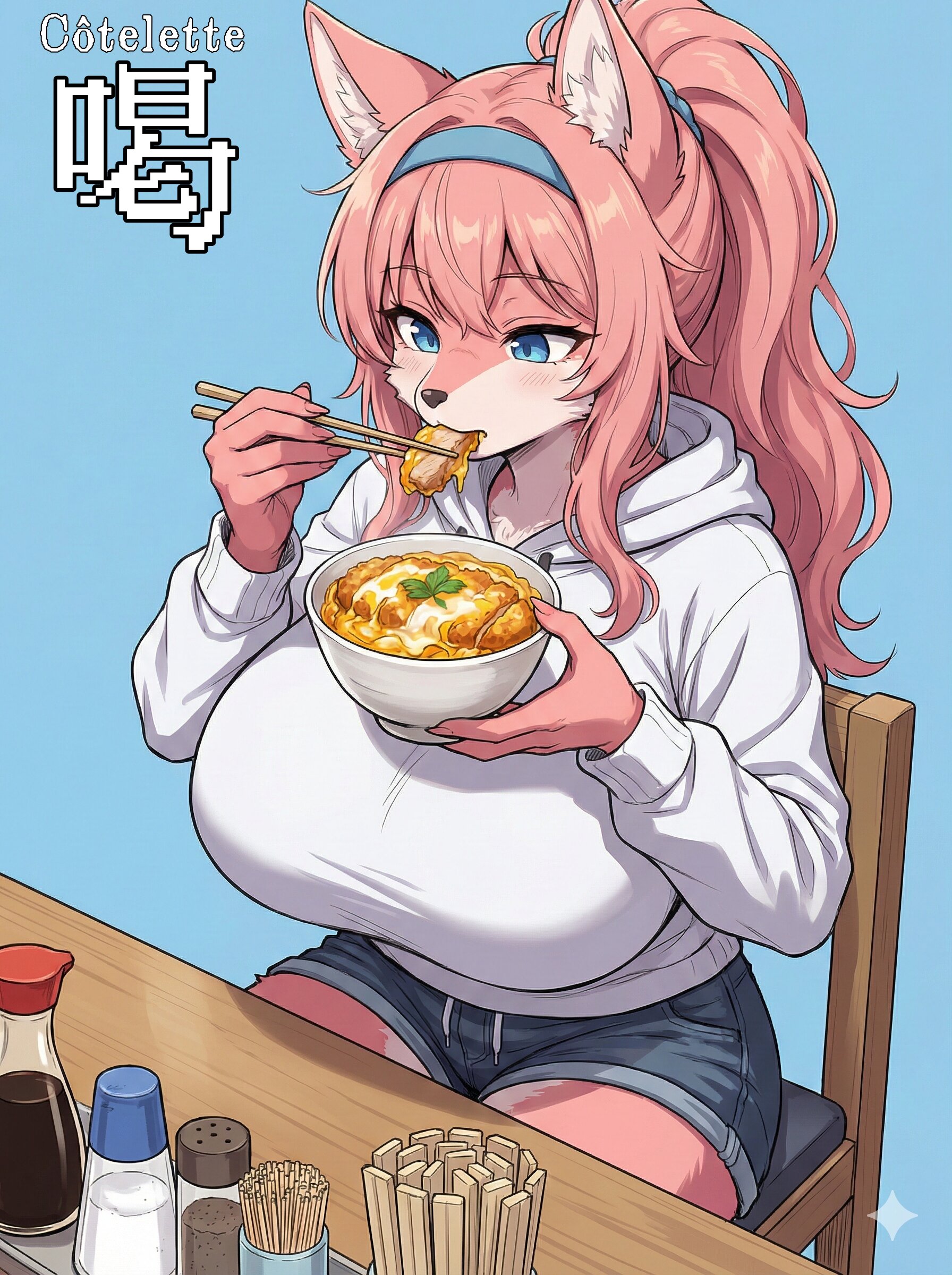 アスペクト比3:4の2Dイラスト。強めの陰影とコントラスト。線は細く薄くする。可愛らしい見た目。バストは大きく、長くする。ショーツはデニム製。キャラクターの特徴をそのままに、構図とポーズを変更する。背景は水色。視線を下に向けている。卵綴じしたカツ丼を箸で食べているキャラクターのイラスト。カツ丼の食器は白い丼。キャラクターは椅子に座り、丼を底から持っている。前面のテーブルの上には醤油、塩、胡椒、爪楊枝、割り箸の束が置かれている。キャラクターを斜め前から見る。遠近感がある。光沢を無くす。完全に新しいイラスト。