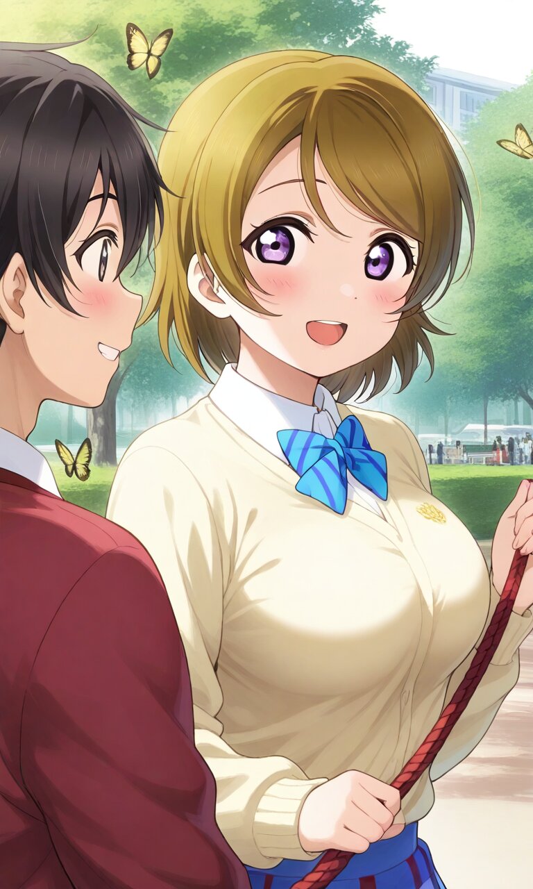 Couple, boy and girl, two people only,absurdres, ultra-detailed, master piece, high resolution, 8k, Boy, girl, couple,masterpiece, best quality, extremely detailed, beautiful detailed girl , watching longingly from outside rope circle, butterflies fluttering near her chest symbolizing hidden longing, boy in background smiling gently while jumping, warm golden afternoon light in park, perfect anatomy BREAK the boy(original boy,black hair,short hair, black eyes) BREAK the girl(<lora:hanayo-koizumi-s1-ponyxl-lora-nochekaiser:1>, hanayo koizumi, short hair, brown hair, purple eyes, large breaths),