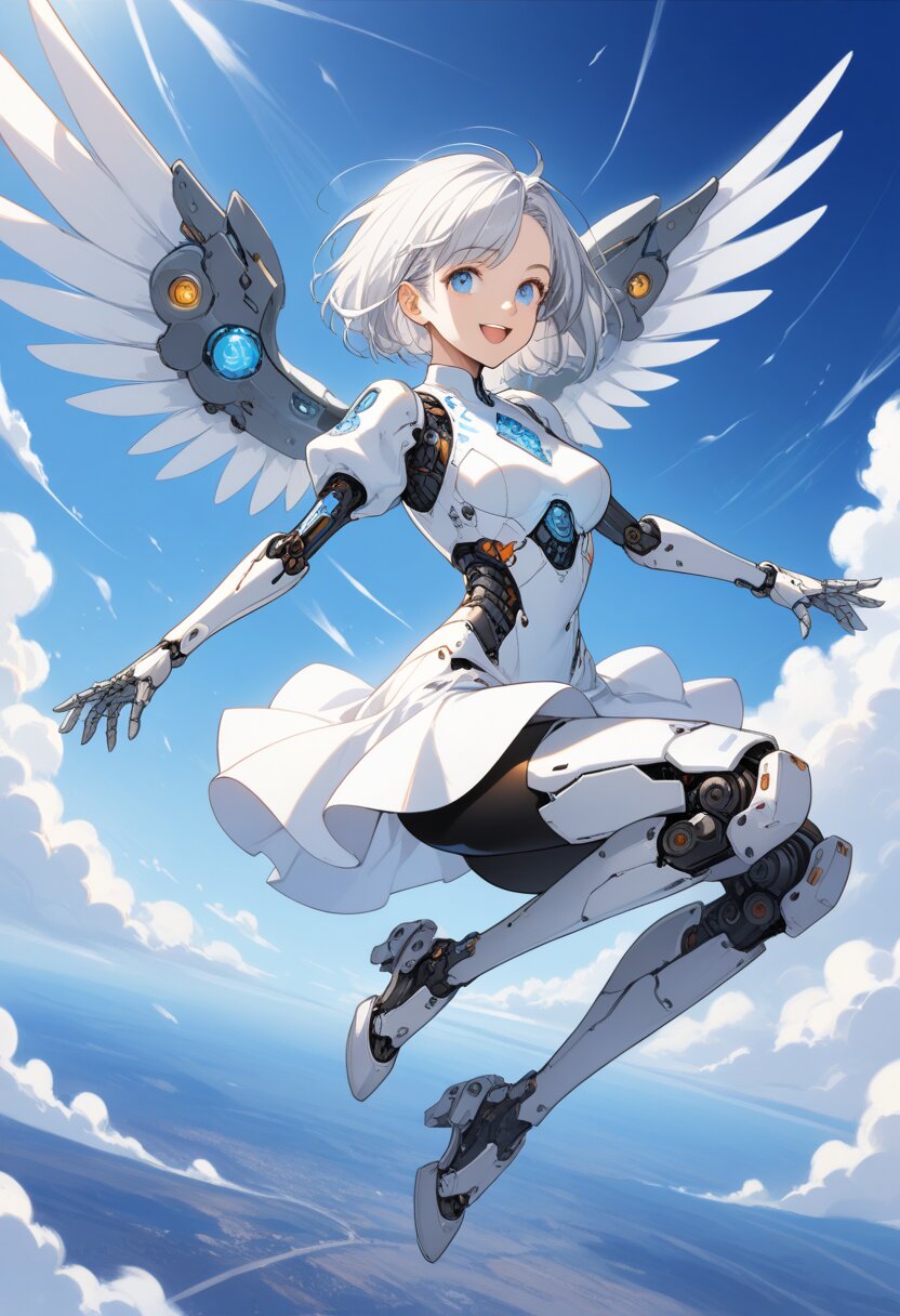 Highly detailed and high resolution japanese 2.5D game style illustration. 1girl, 25 years old, mature, medium breasts, silver short hair, pretty face, small blue eyes, modest white dress, mandarin collar, white knee-length skirt, puff sleeves, magical decorative embroidery, blue gem on chest, cybernetic android body, (mech joints, mech legs, cyborg hands:1.2), black tights, mech high-heeled shoes, (a pair of white mechanical angel wings on her back), silver hair, flying, sky diving, dynamic flying pose, blue sky, white clouds, stratosphere background, smile, happy, opened mouth, solo, backlighting, depth of field, looking at viewer, from side, full body, medium shot, The light and striking composition of this image is like concept art from a movie. blurry background, masterpiece, best quality, high quality, absurdres,sketch_style, black_line, flat_color, 2D_image, clear_lines