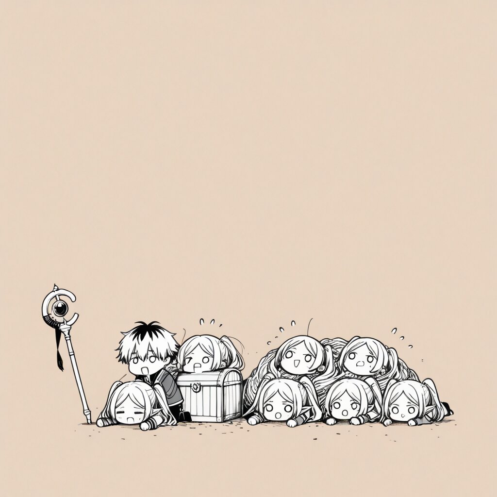 (loli:2.0),,hilarious pile-up accident, poor Stark being flattened and squished by Frieren and Fern falling on him, Stark face down with despair expression "orz", sweat drops flying, Fern on top looking panicked with sweat and teary eyes, long silver hair flowing, Frieren half-laid on them both with surprised blank face, legs kicking up in the air, big boots and thighhighs visible, Stark's axe and Fern's staff scattered around, big treasure chest toppled over, mint cyan and deep emerald tones, beautiful detailed anime illustration, soft cel-shading mixed with delicate ink lineart, cute chibi proportions but normal body ratio, very expressive faces, masterpiece, trending on pixiv, by abetsufosa style