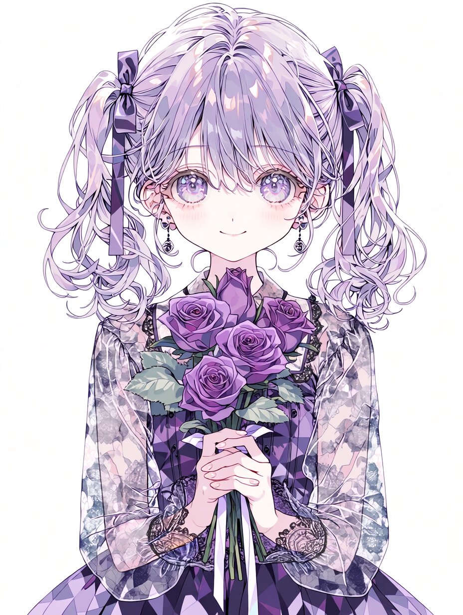 Girl, geometric patterns, twin tails, purple eyes, large eyes, upturned eyes, fair-skinned, petite, slender build, blouse, gal style, hair ribbon, light purple hair, highlights, colorful hair, cute face, purple lace dress with shades of purple. Holding a bouquet of purple roses. Gentle smile.