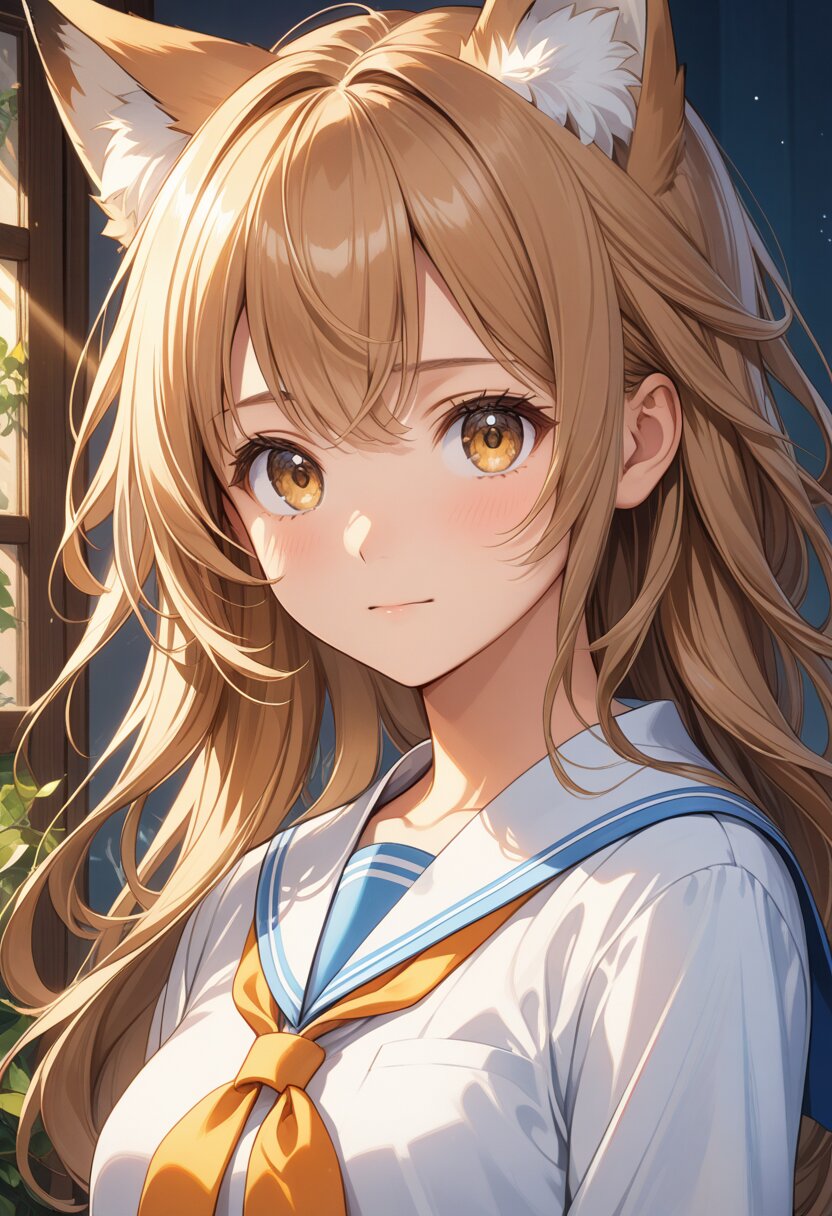 (high resolusion,illustration,ultra detailed 8k art,extremely detailed CG,official art,clothes reflecting light,detailed shiny skin,detailed background:1.3), ((highly detailed beautiful face and eyes),anime_style, fox_ears, girl, light_brown_hair, double_eyelids, long_eyelashes, fluffy_tail, school_uniform, full_body, soft_lighting, expressive_eyes, delicate_features, clean_color_palette, charming_scene, natural_pose
