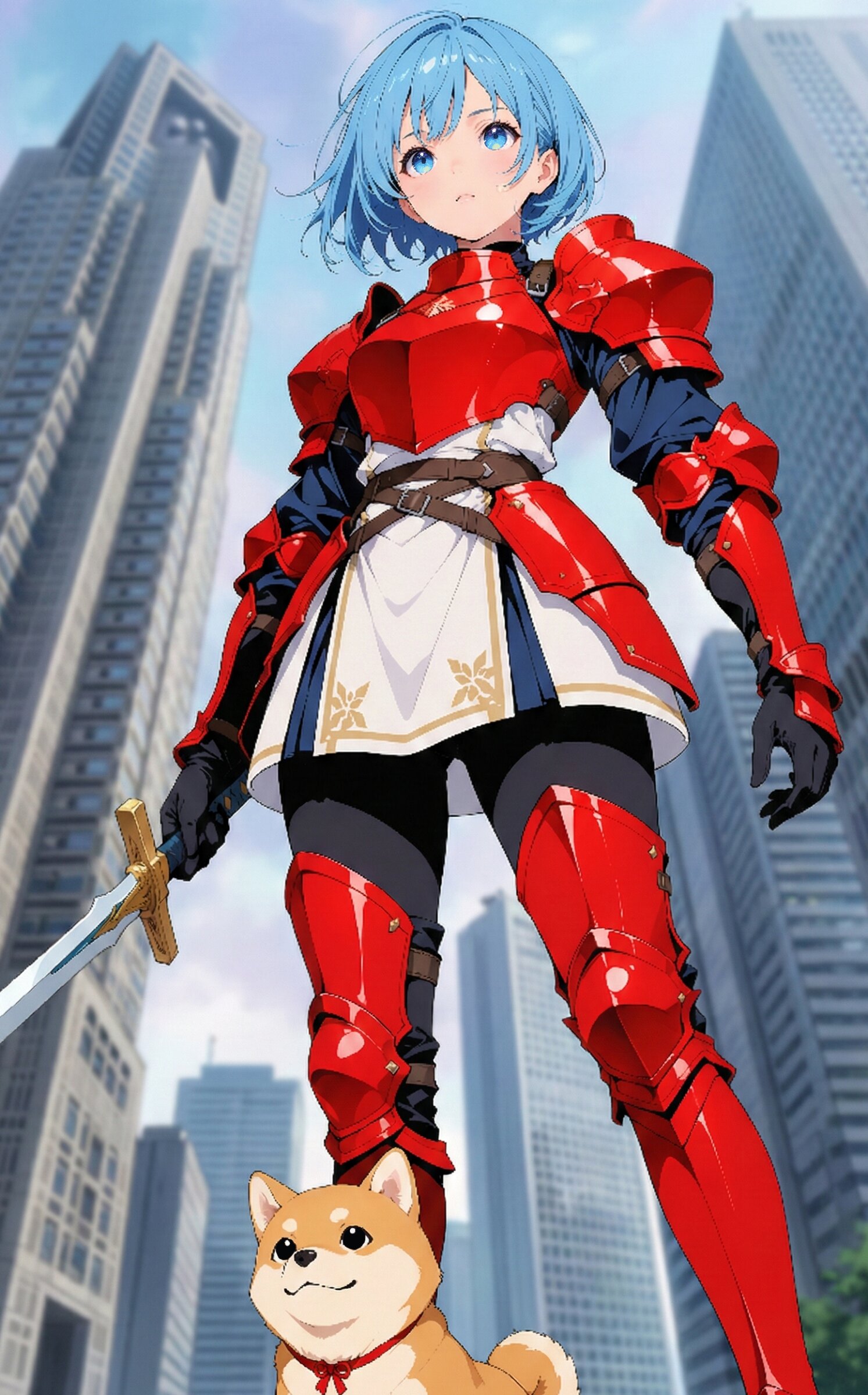 戦闘の最中に突如新宿都庁前に召喚された剣士ちゃんと柴ワンコの図です