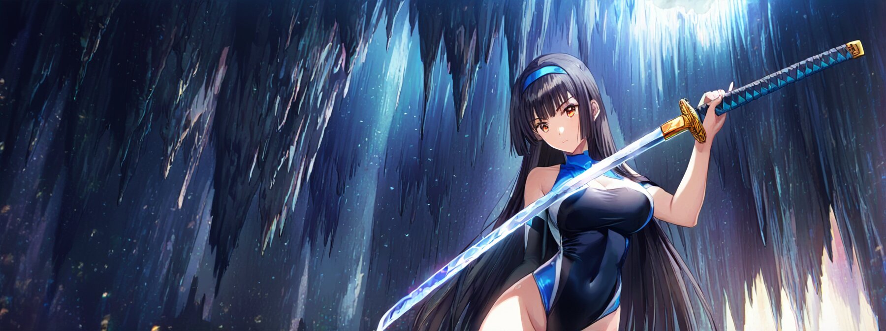 ((masterpiece)), ((best quality)), (ultra-detailed),anime style,cowboy shot, Dark underground cave, stalactites, water droplets, a cute girl, 1girl, large bust, ((Black Racing-style swimsuit)), beautiful black hair, beautiful orange eyes, ((beautiful eyes)),straight hair, (blunt hair), ((blue hairband)), Holding a katana in hand