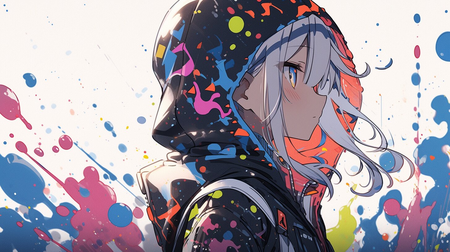 ネオン輝く街の片隅で、白髪の少女はフードを被り、ペイントの飛沫に囲まれながら佇む。彼女はストリートアーティストとして、日常の喧騒をキャンバスに変える冒険者。鮮やかな色彩が飛び散る中、彼女の瞳には過去の記憶が浮かぶ。風が運ぶインスピレーションに身を委ね、次なる傑作を生み出す瞬間を待つ。この一瞬が、彼女の心の旋律を奏でる物語の始まりだ。