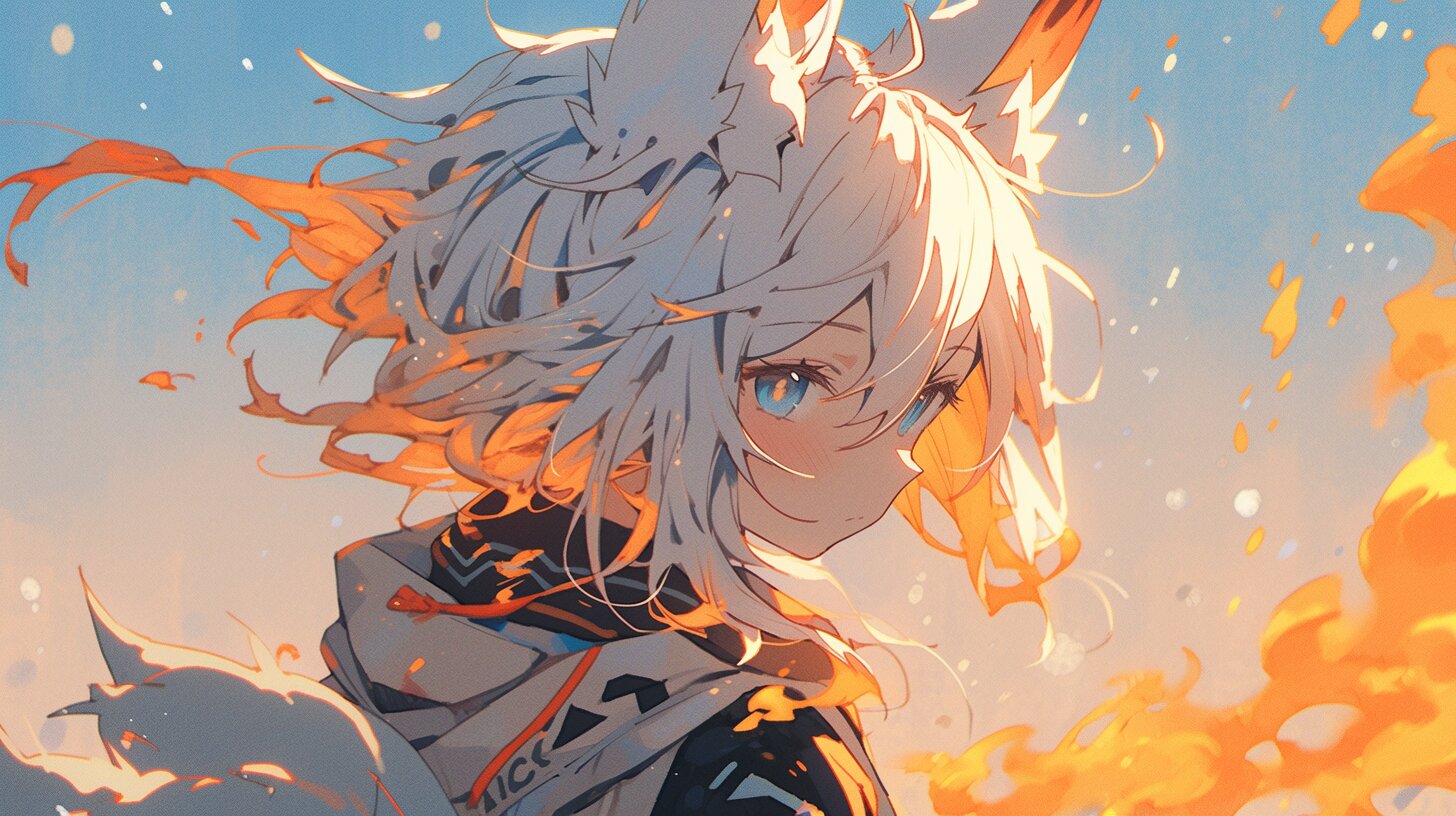 夕陽が空を赤く染める中、白い髪の狐耳少女が振り返る。彼女は炎のような粒子をまとい、穏やかな微笑みを浮かべている。これは彼女の冒険の瞬間。古の森を守る守護者として、旅の途中で出会った不思議な力に触れ、心が揺らぐ。風に舞う炎は、彼女の内なる情熱を象徴し、次なる戦いへの予感を漂わせる。読み手は、彼女の物語に引き込まれ、想像を広げずにはいられない。